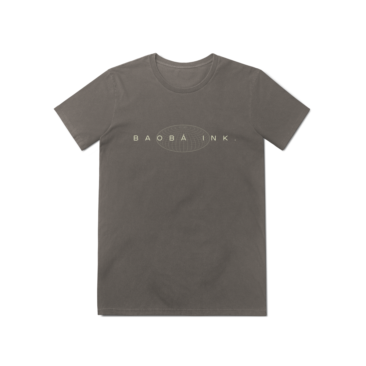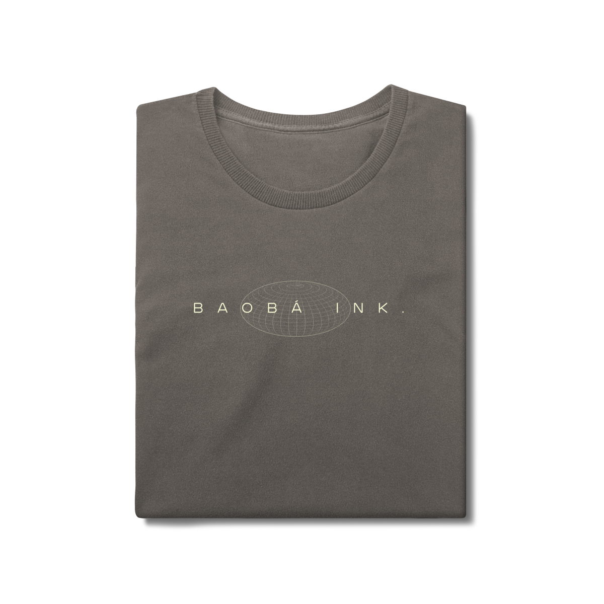 • Estampa frontal “BAOBÁ INK.” sobre esfera em wireframe, símbolo da visão global e da mente em expansão.