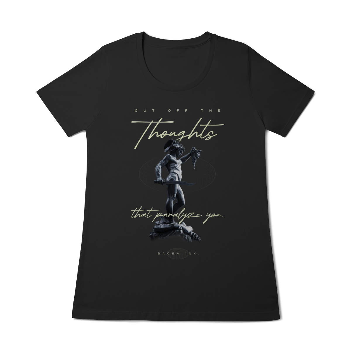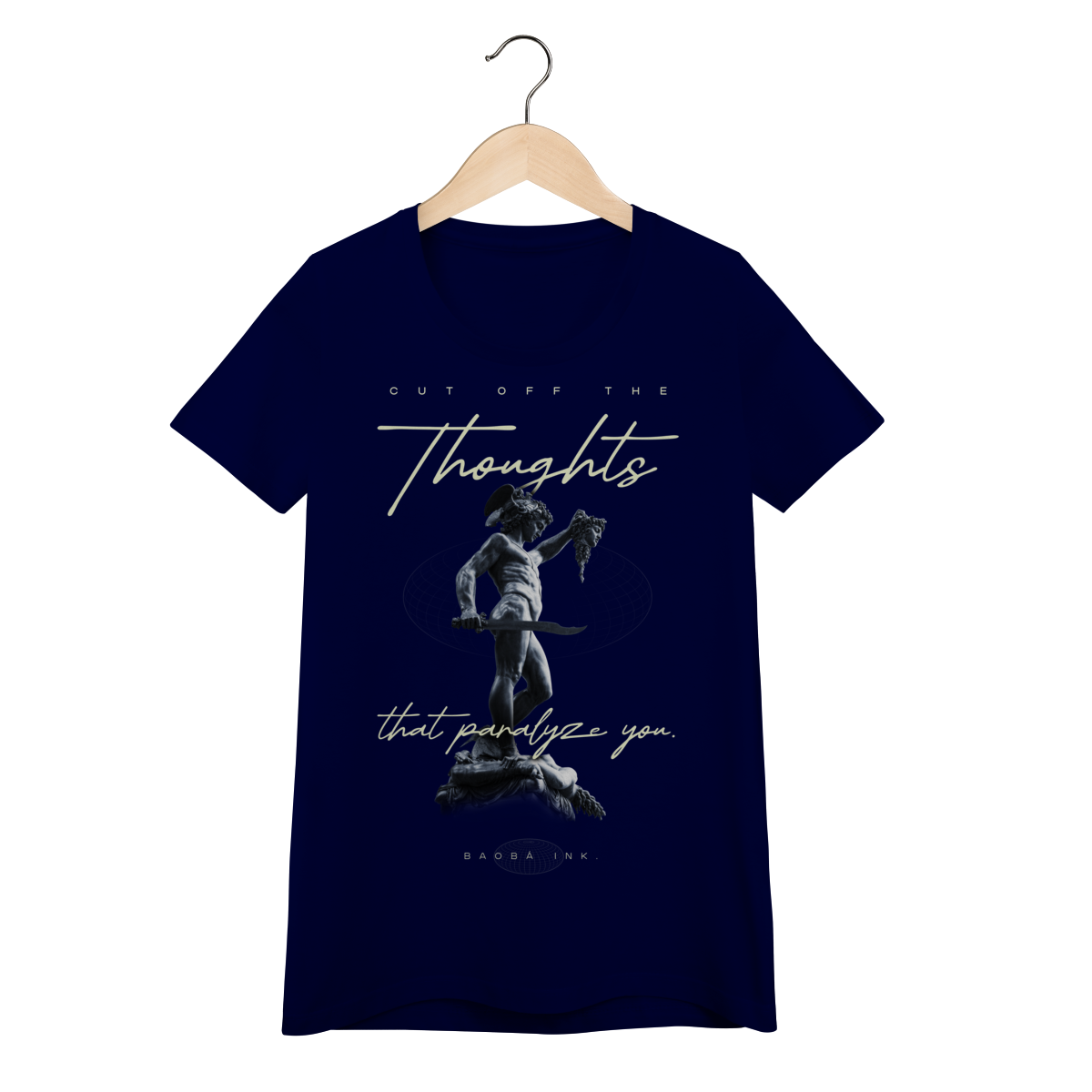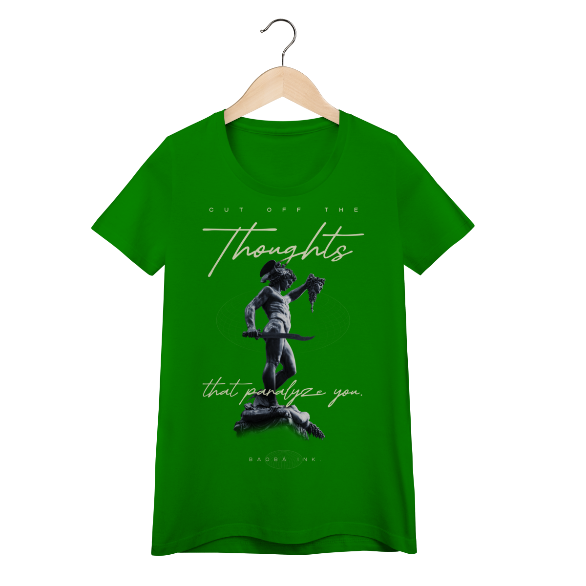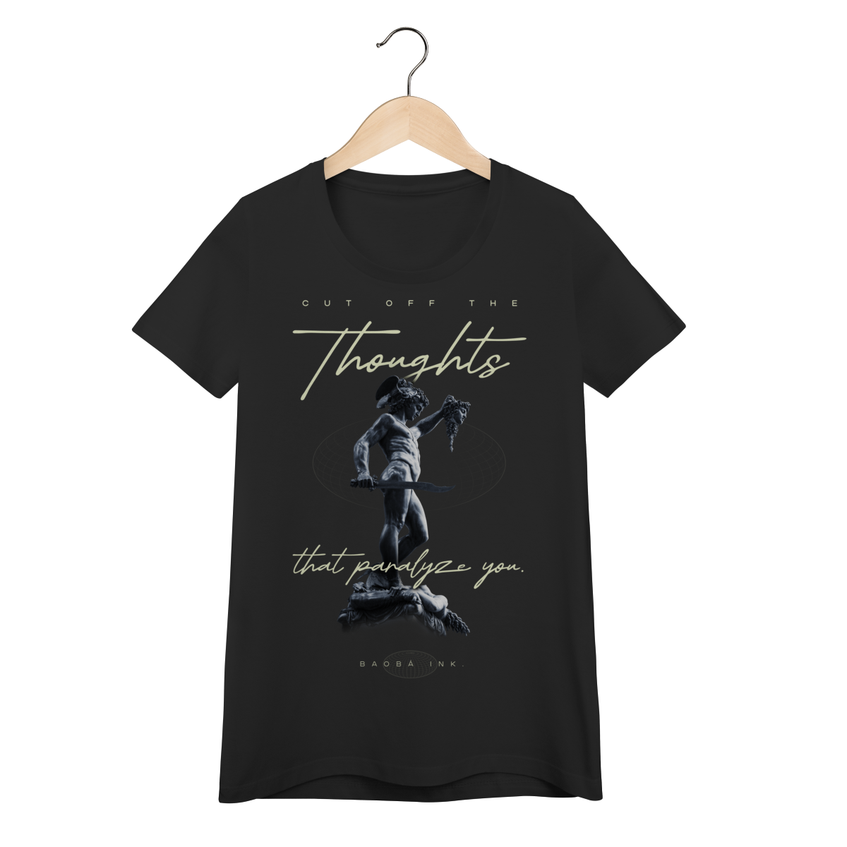 • Estampa frontal “Cut off the thoughts that paralyze you” com arte exclusiva Baobá Ink.