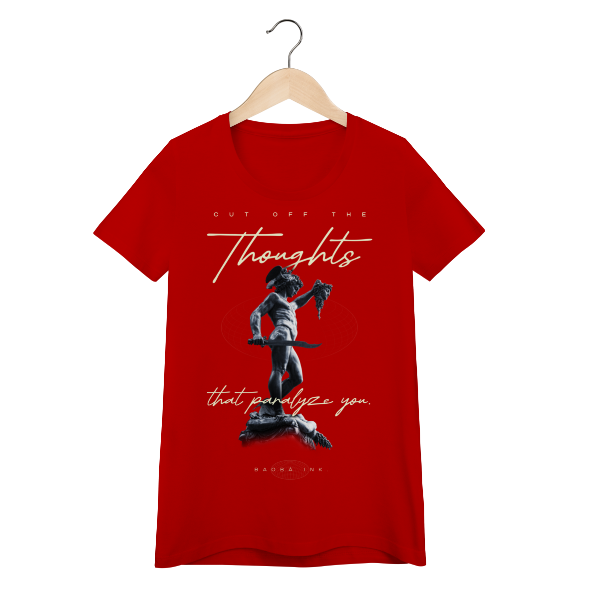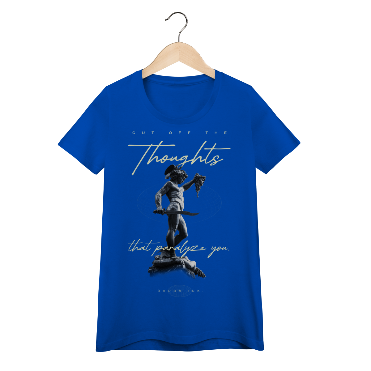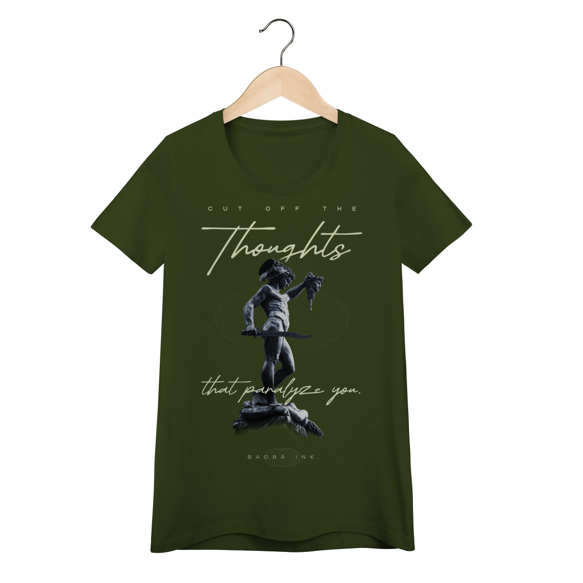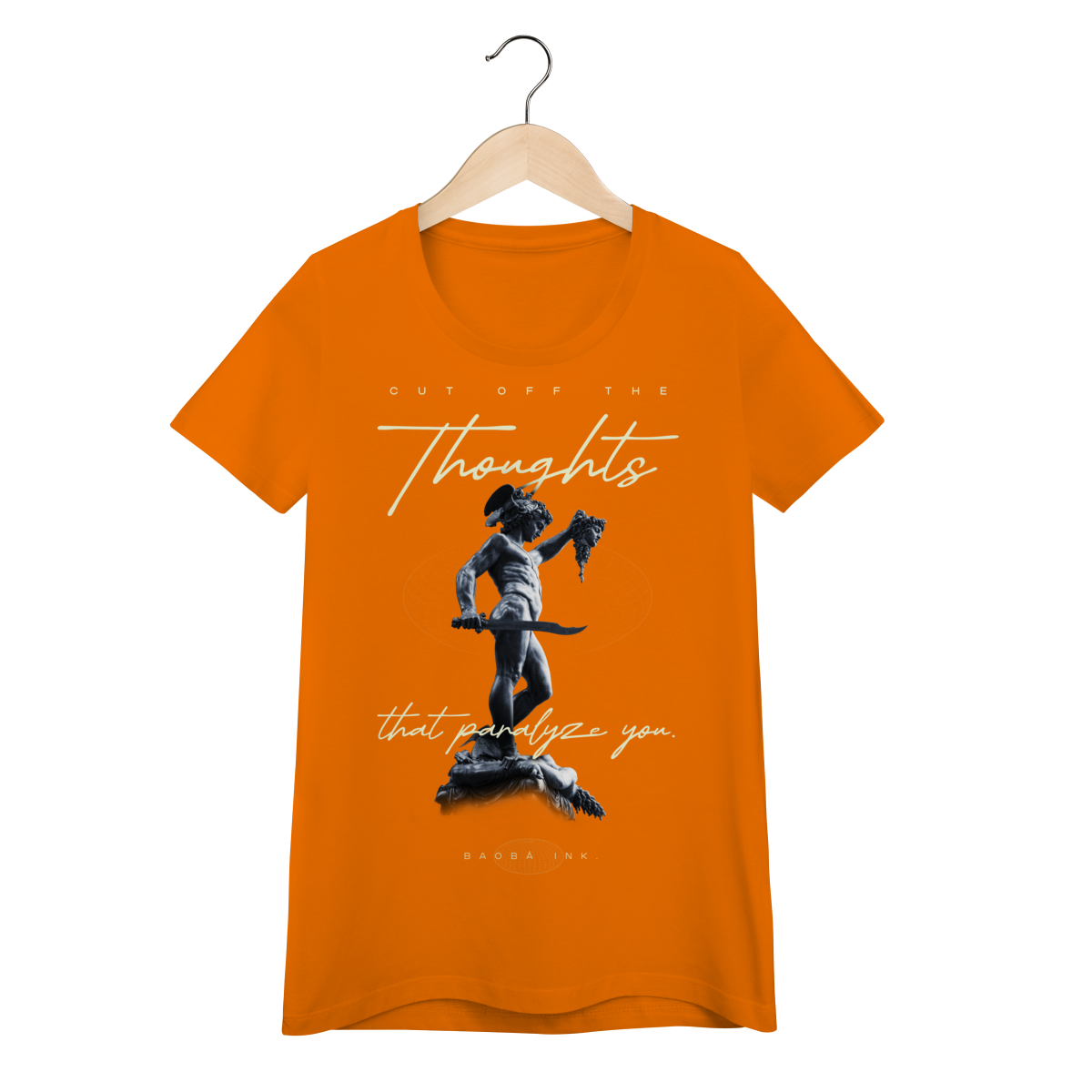 • Estampa frontal “Cut off the thoughts that paralyze you” com arte exclusiva Baobá Ink.