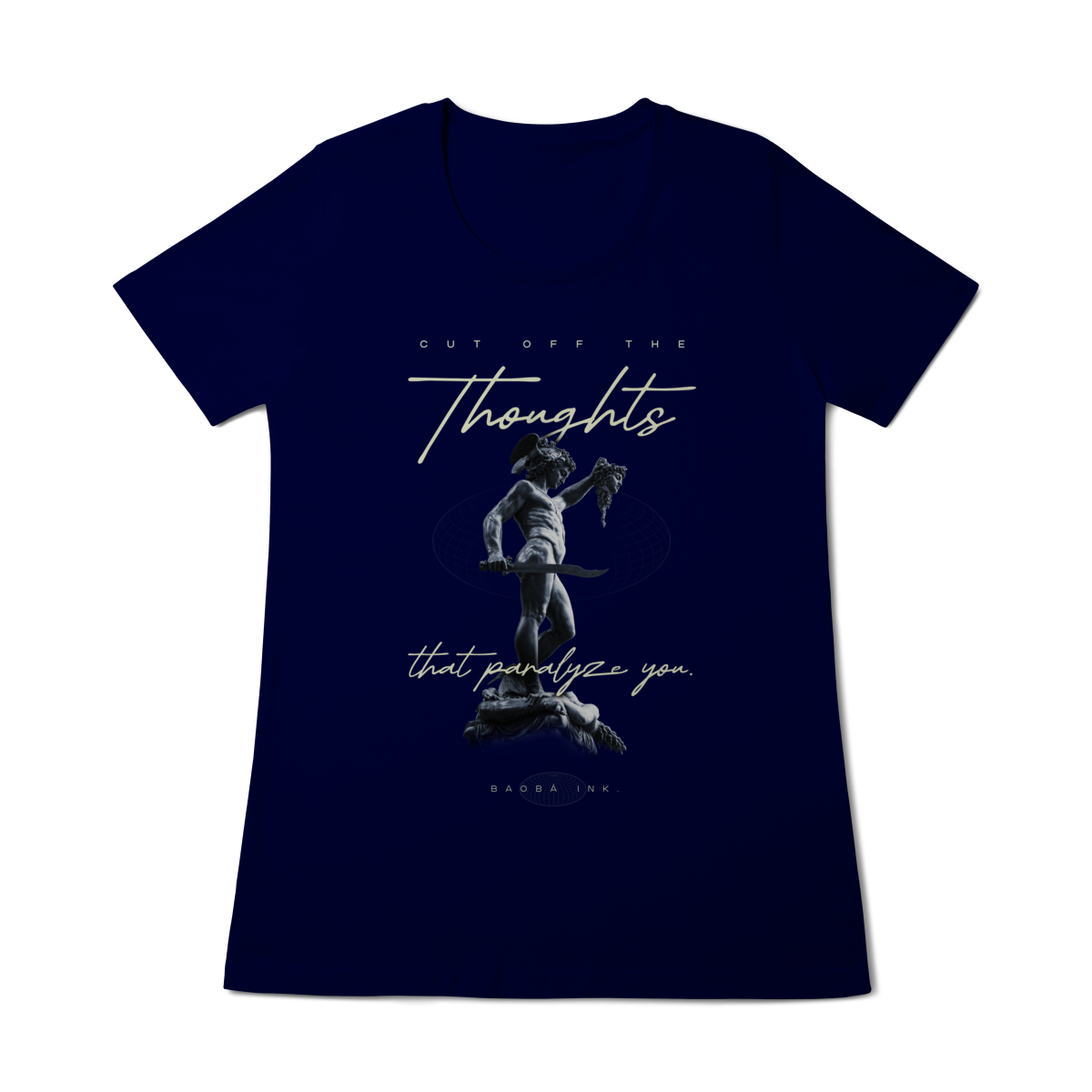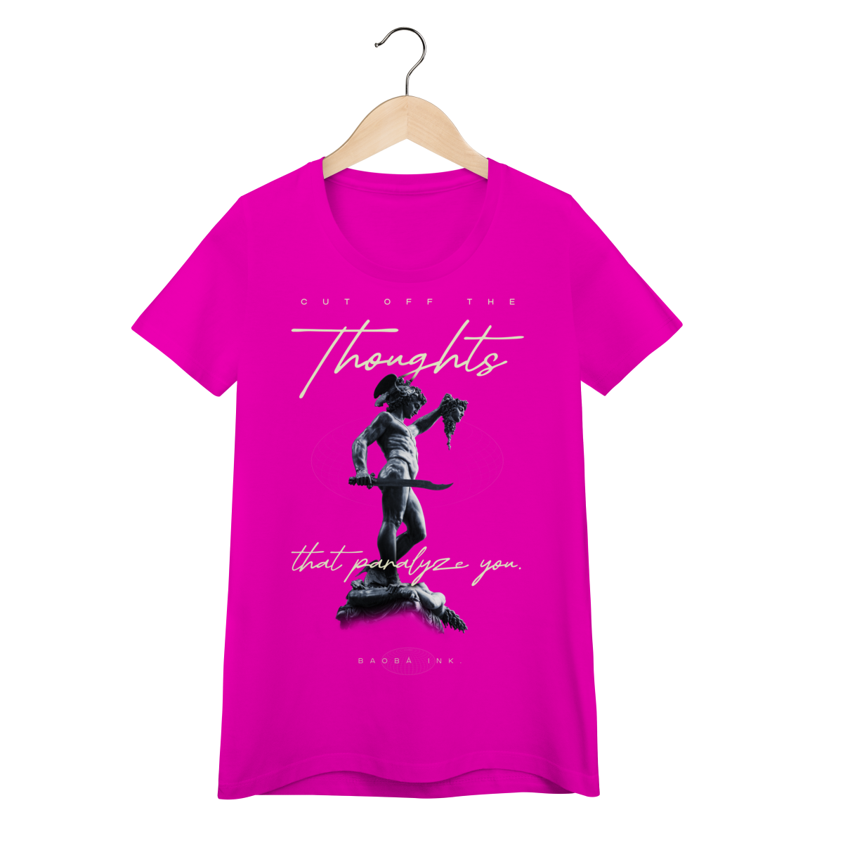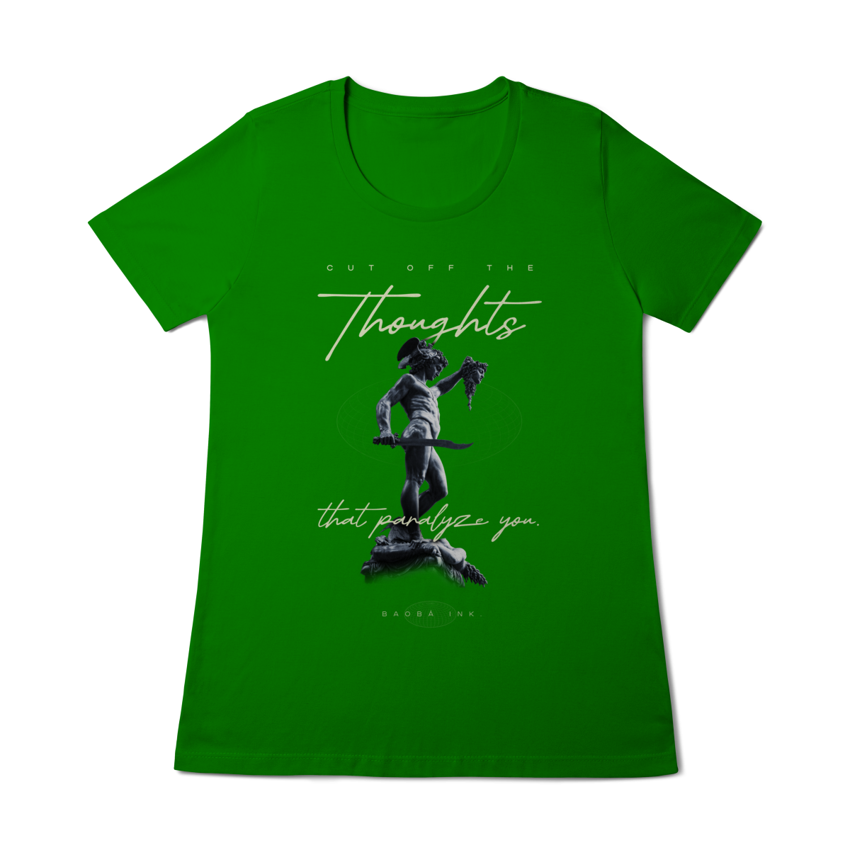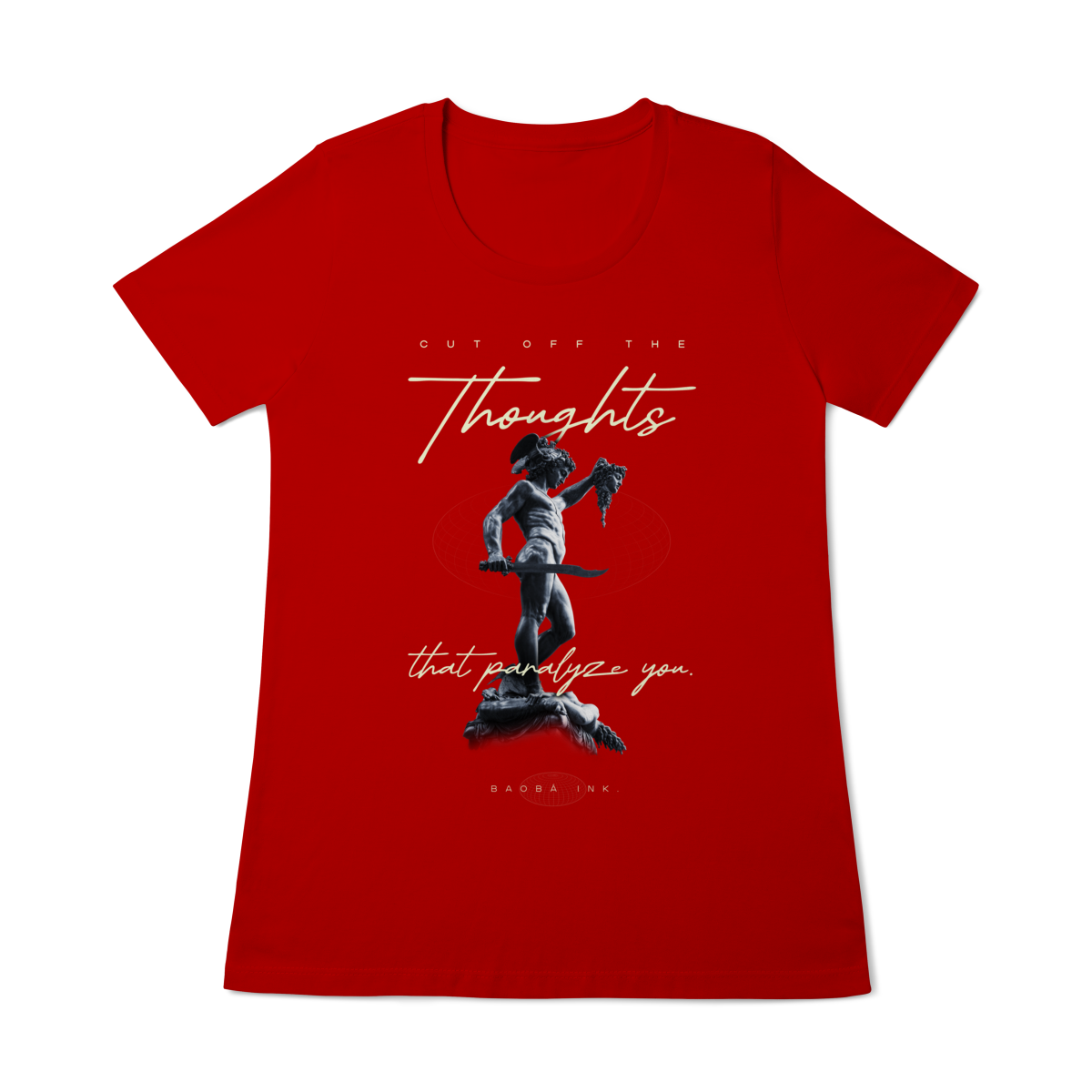 • Estampa frontal “Cut off the thoughts that paralyze you” com arte exclusiva Baobá Ink.