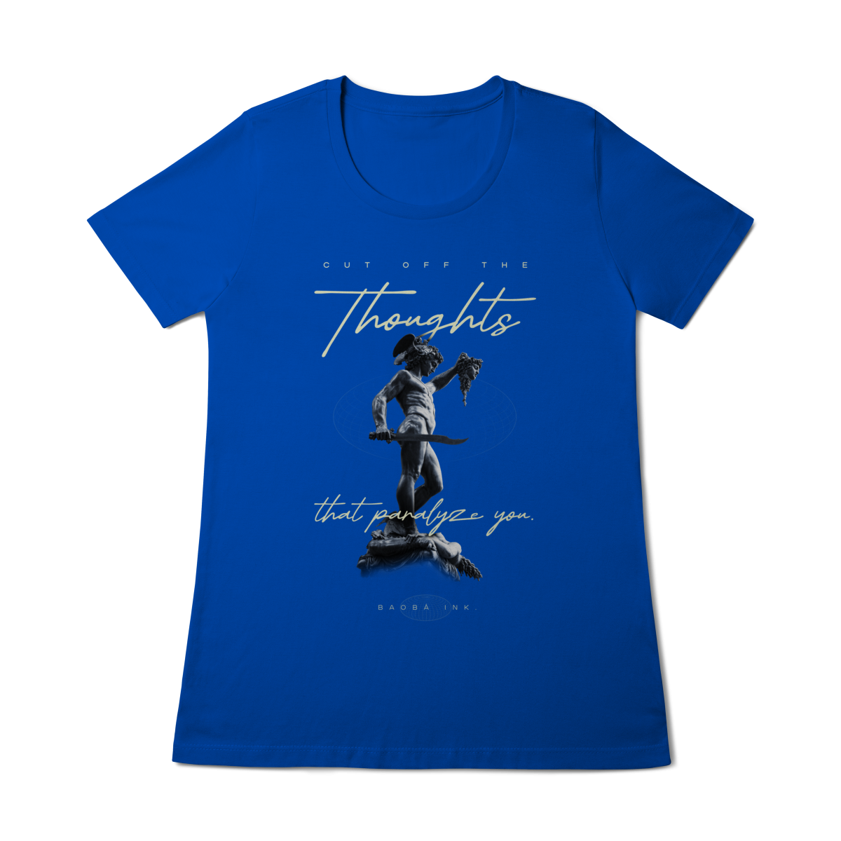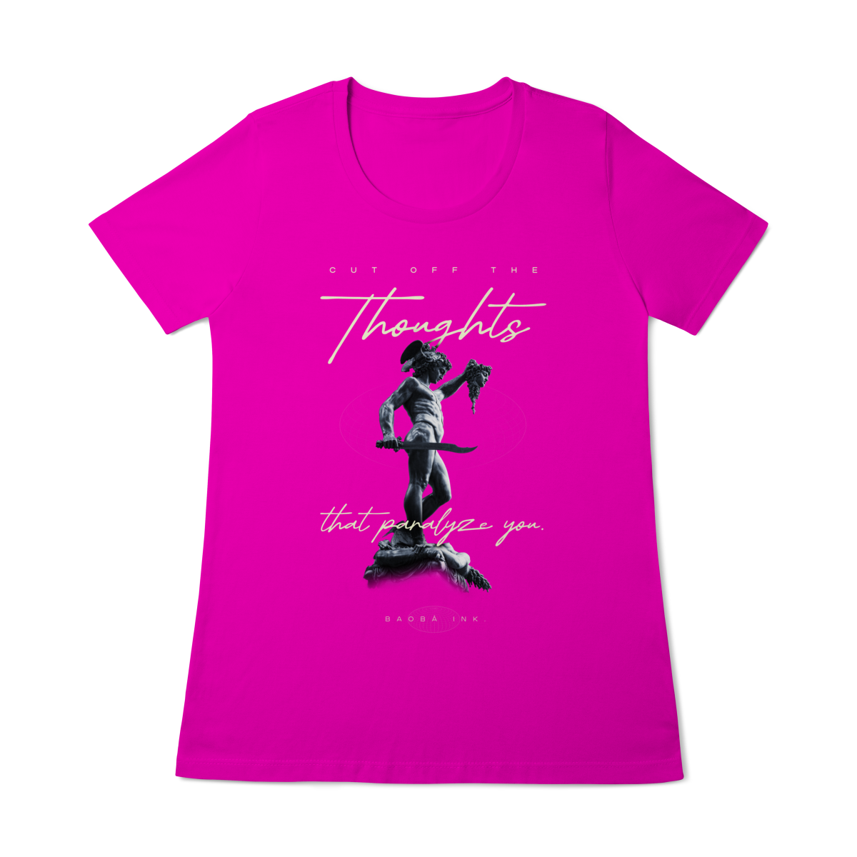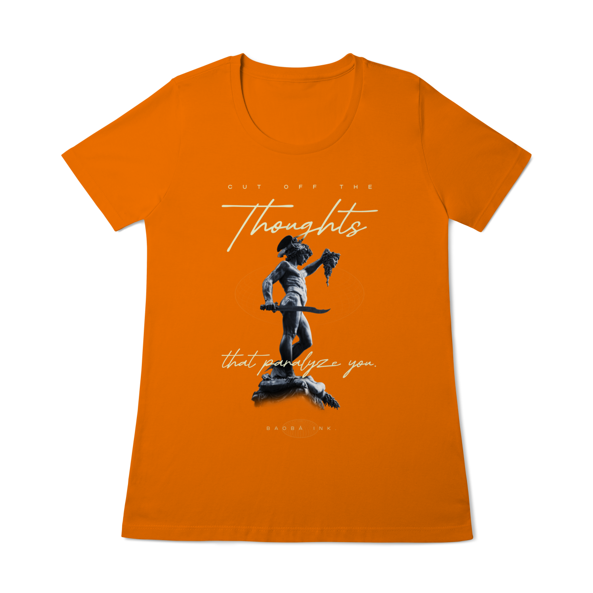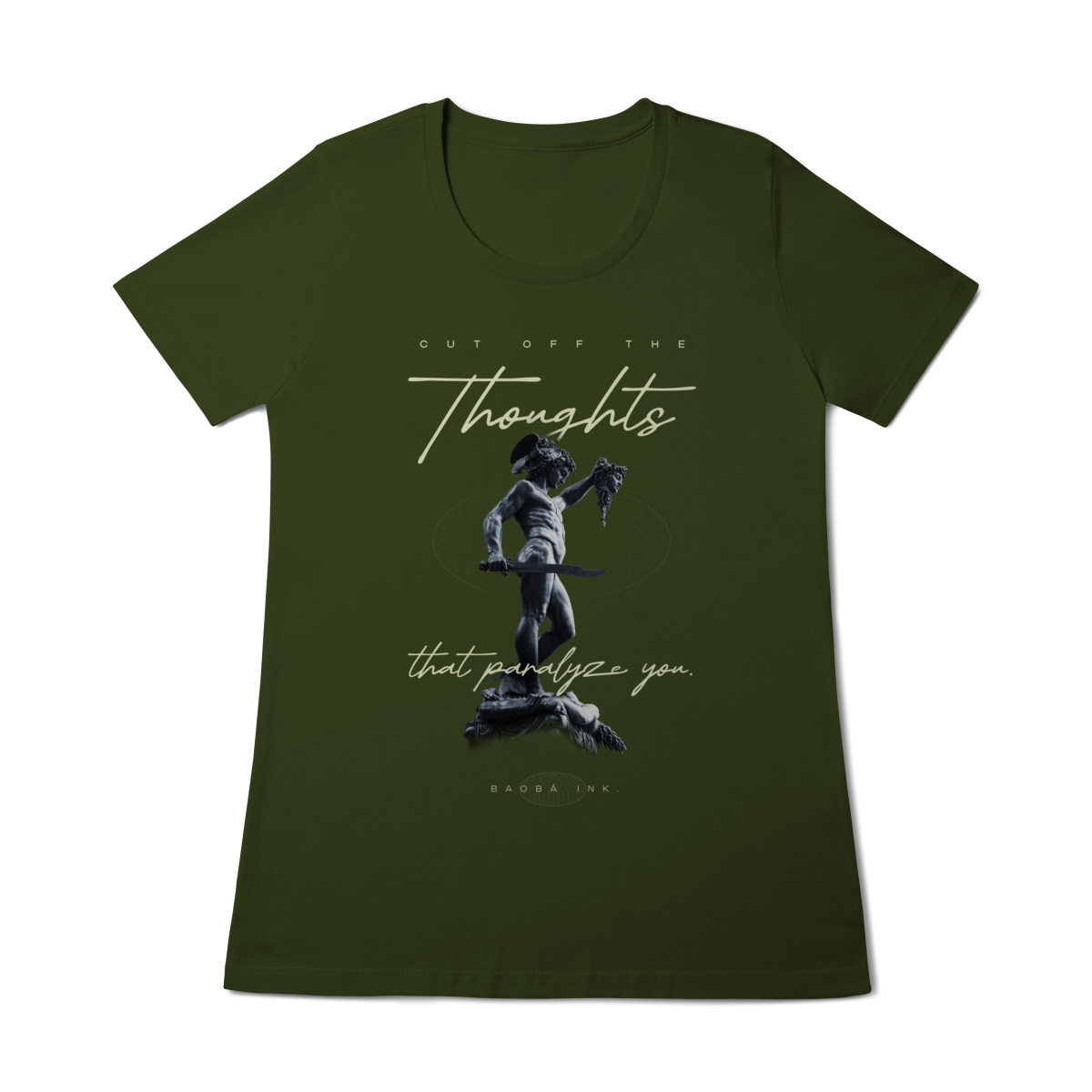 • Estampa frontal “Cut off the thoughts that paralyze you” com arte exclusiva Baobá Ink.