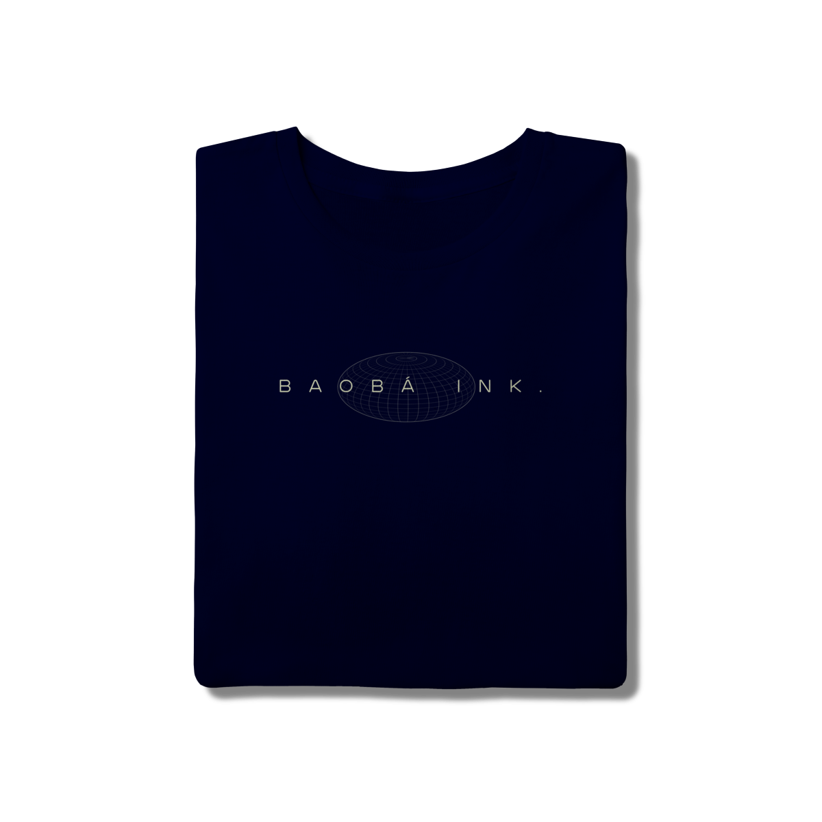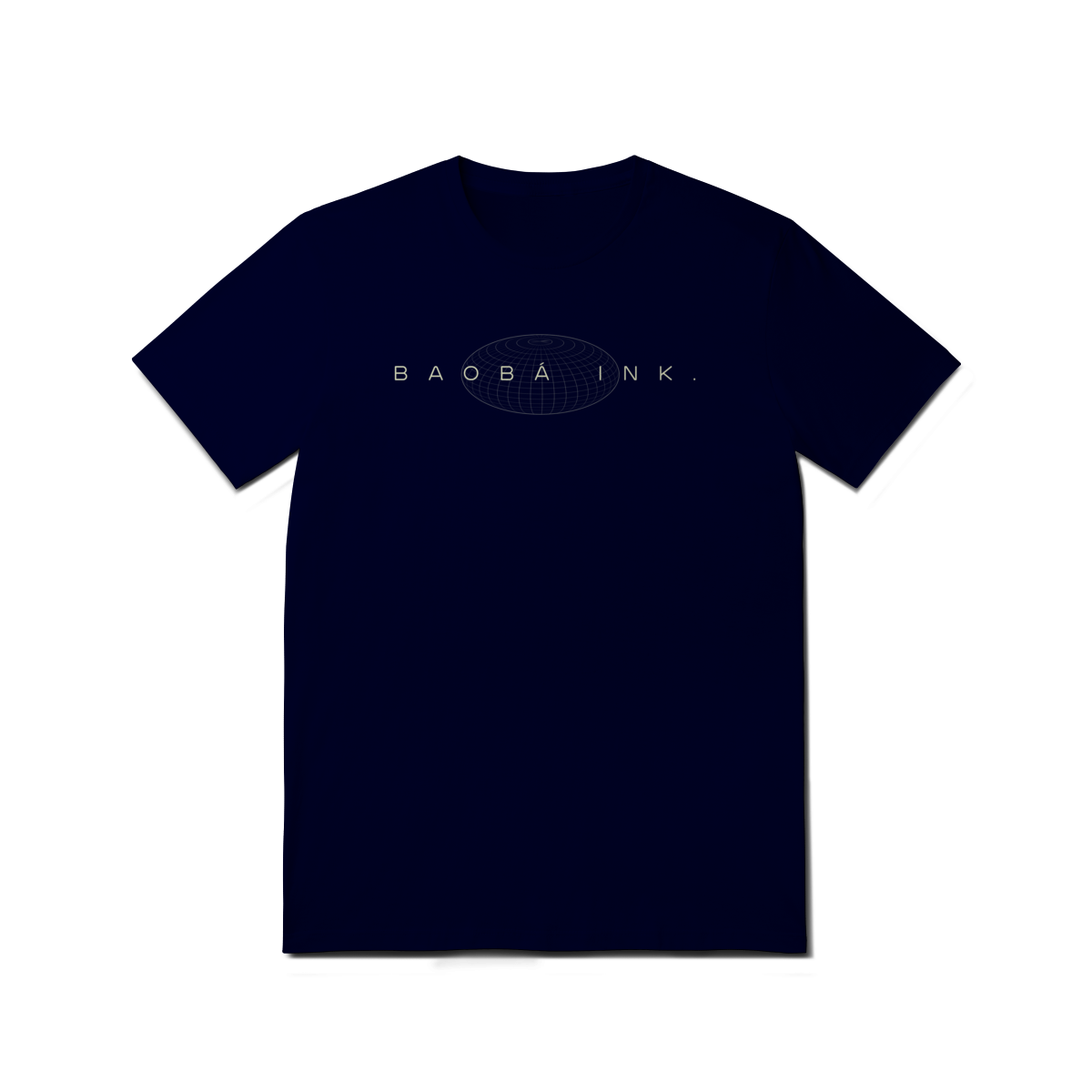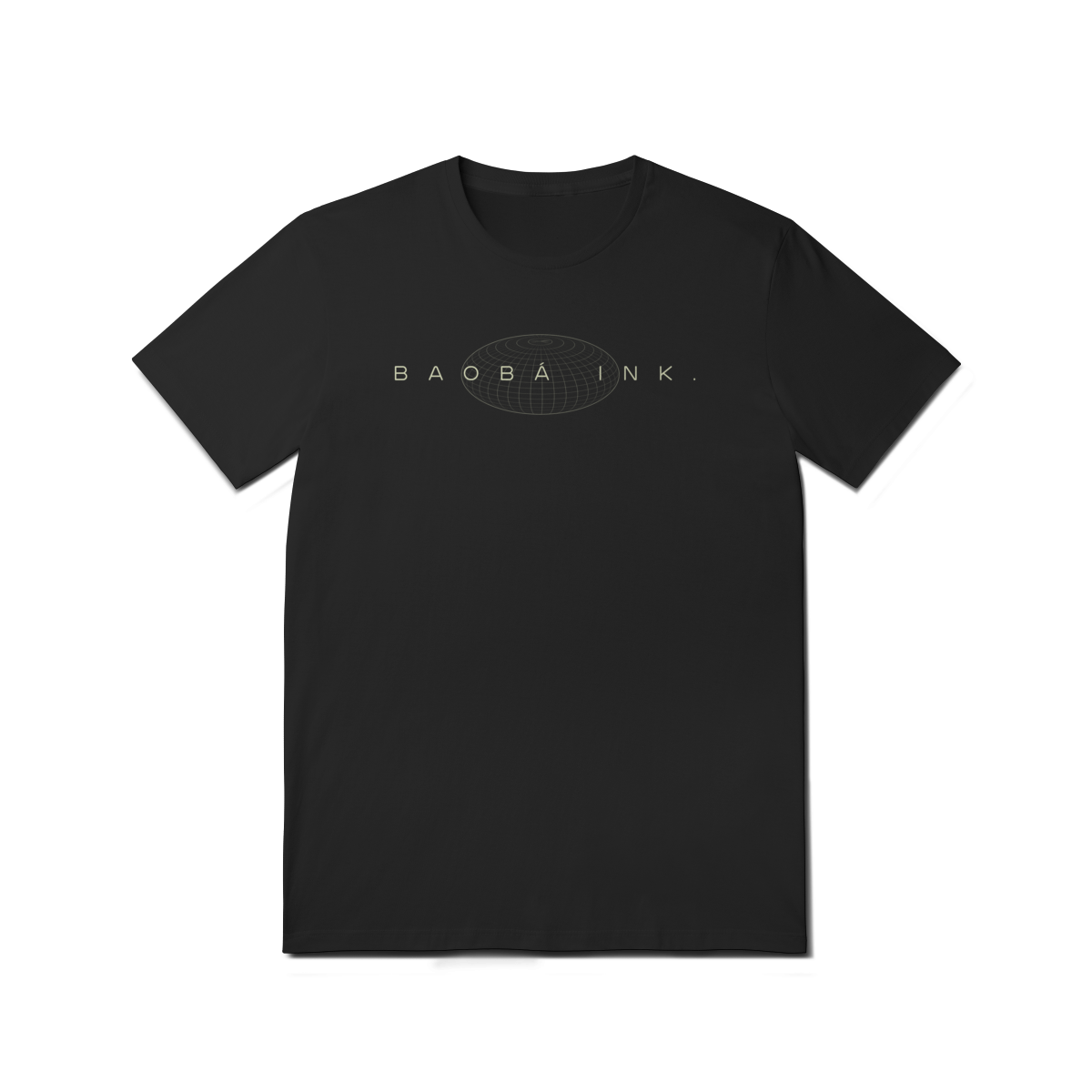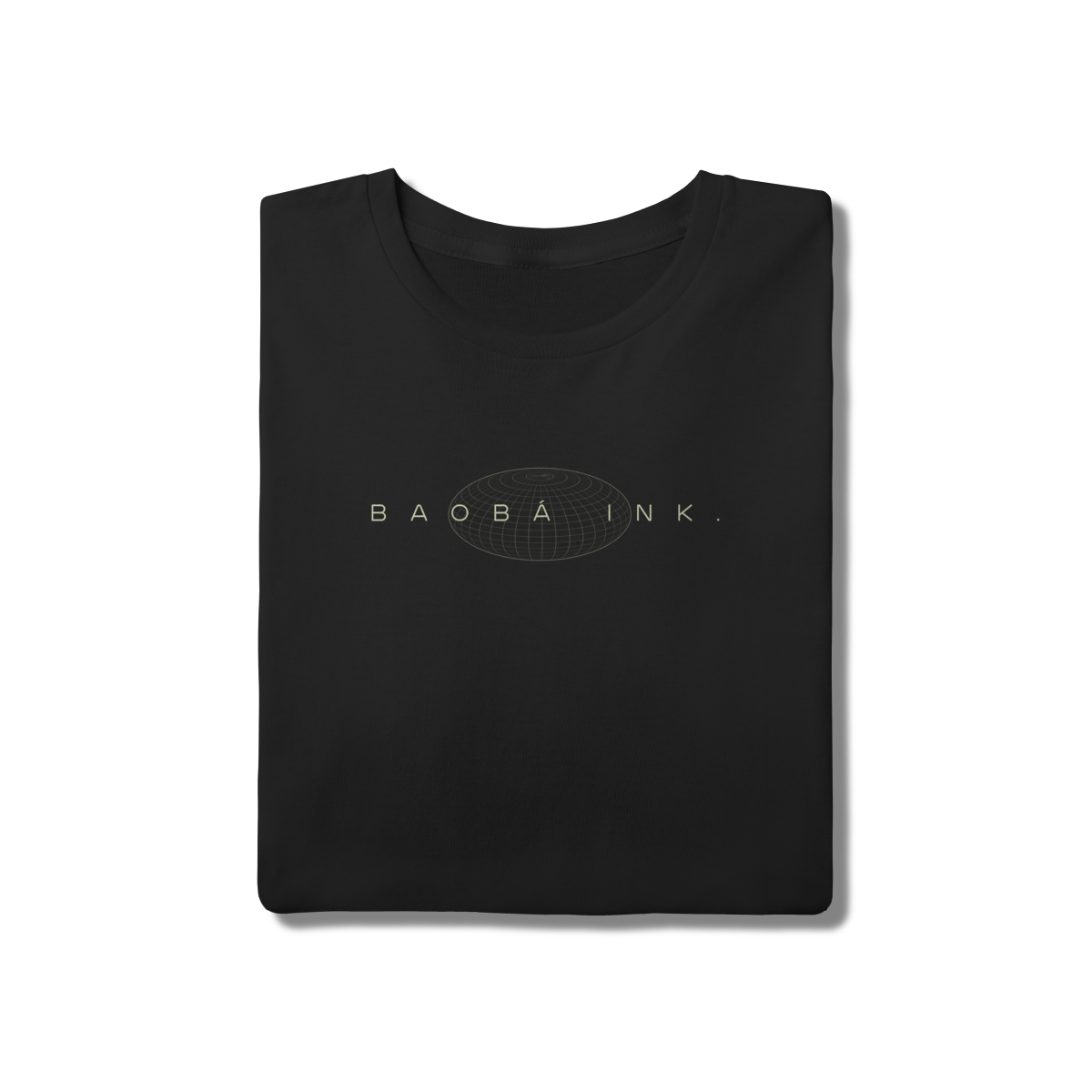 • Estampa frontal “BAOBÁ INK.” sobre esfera em wireframe, referência ao design digital e à expansão de ideias.