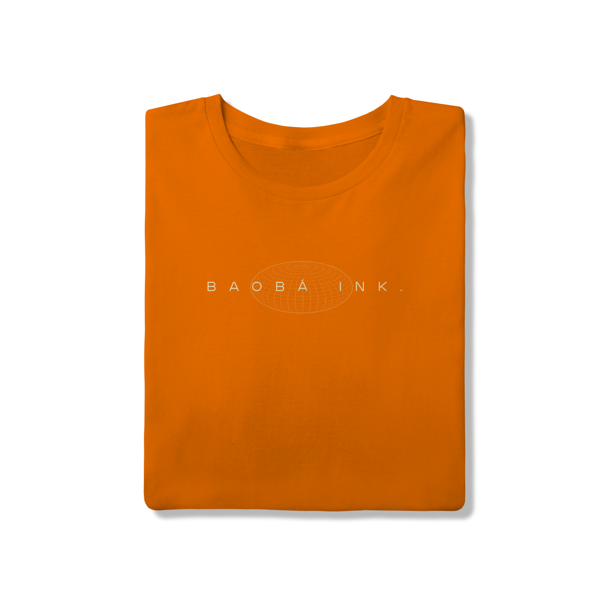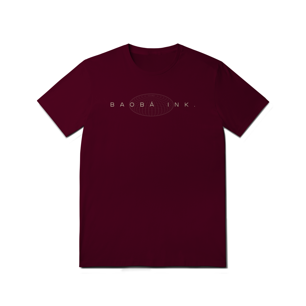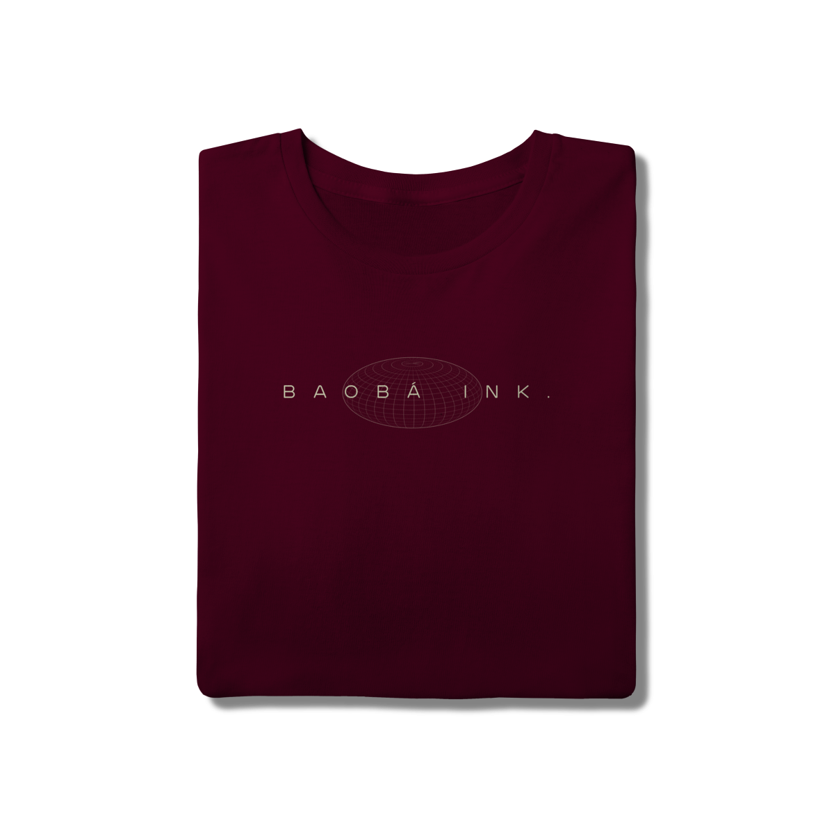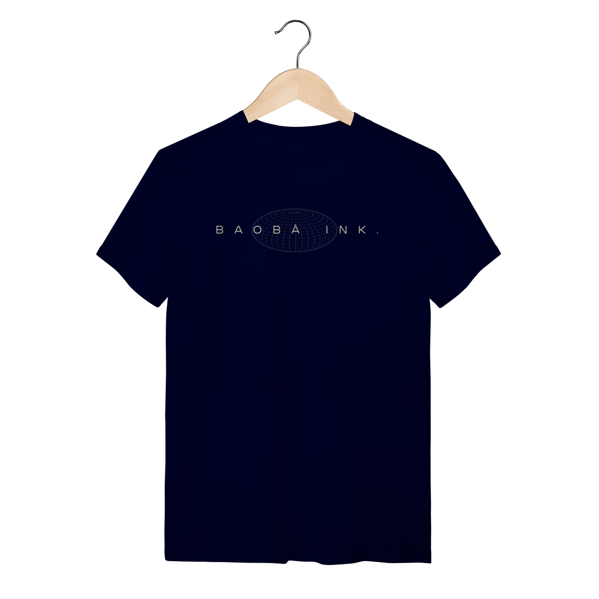 • Estampa frontal “BAOBÁ INK.” sobre esfera em wireframe, referência ao design digital e à expansão de ideias.