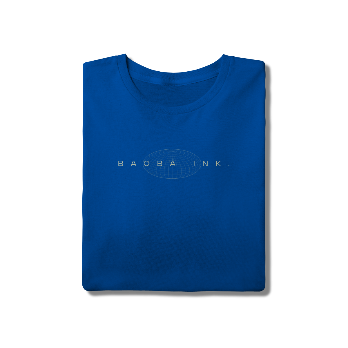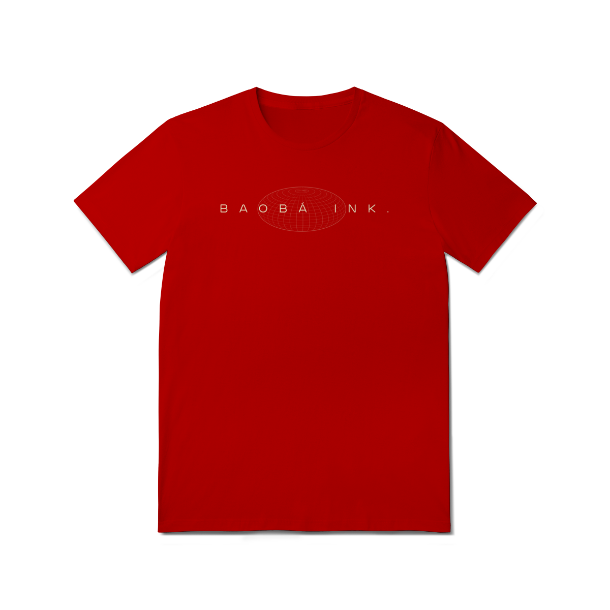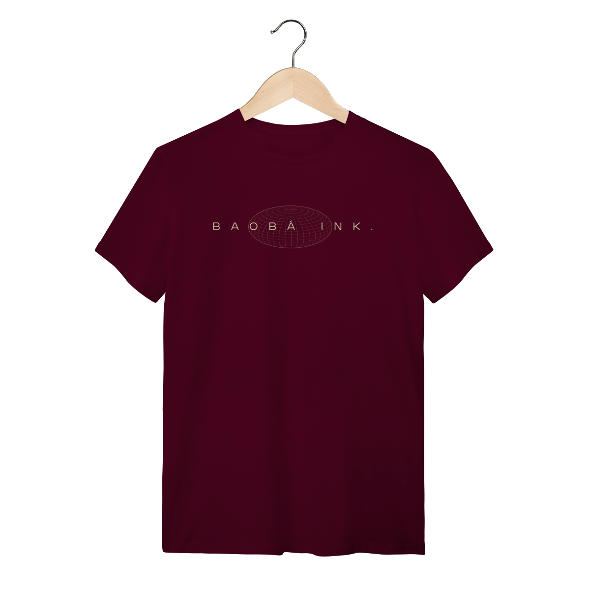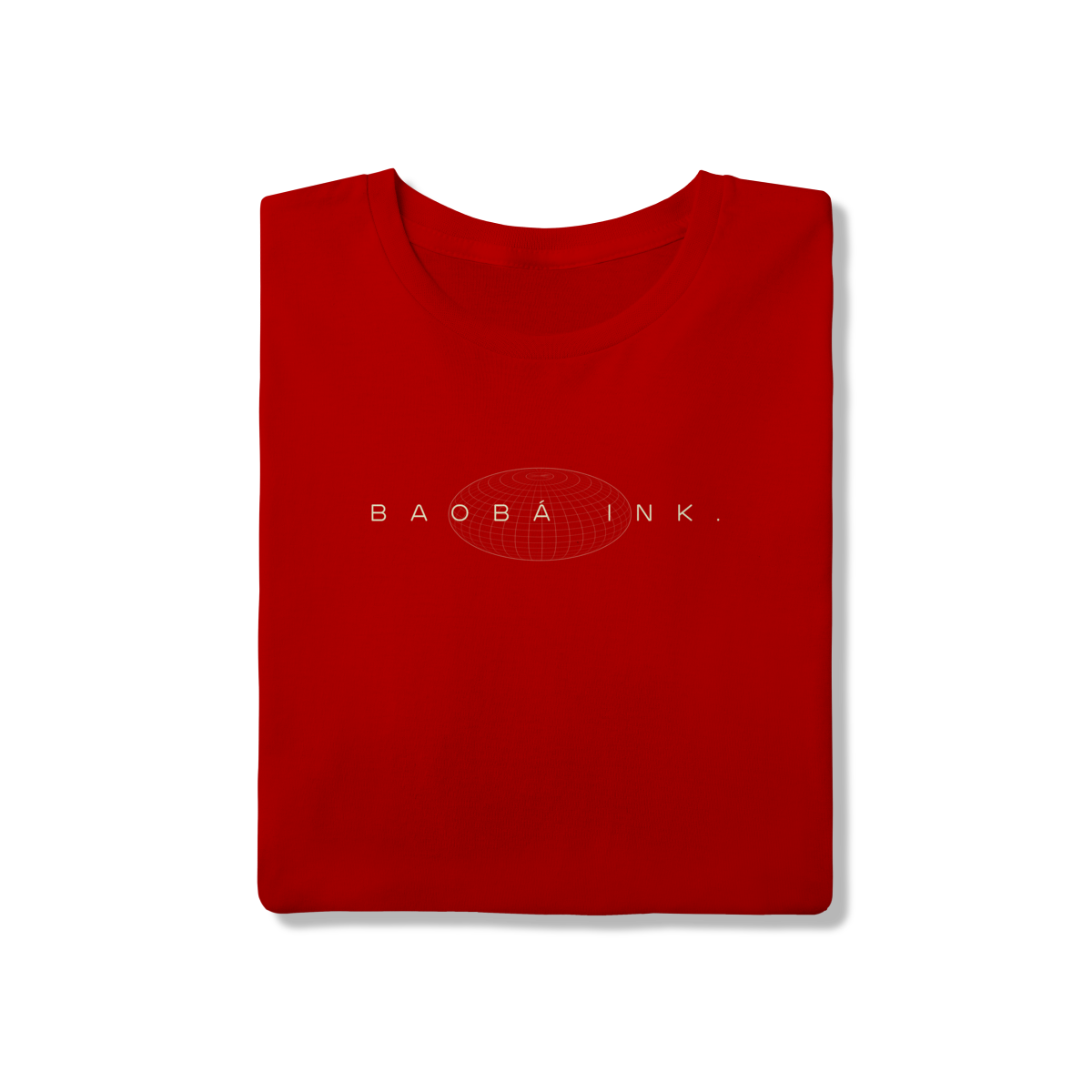 • Estampa frontal “BAOBÁ INK.” sobre esfera em wireframe, referência ao design digital e à expansão de ideias.