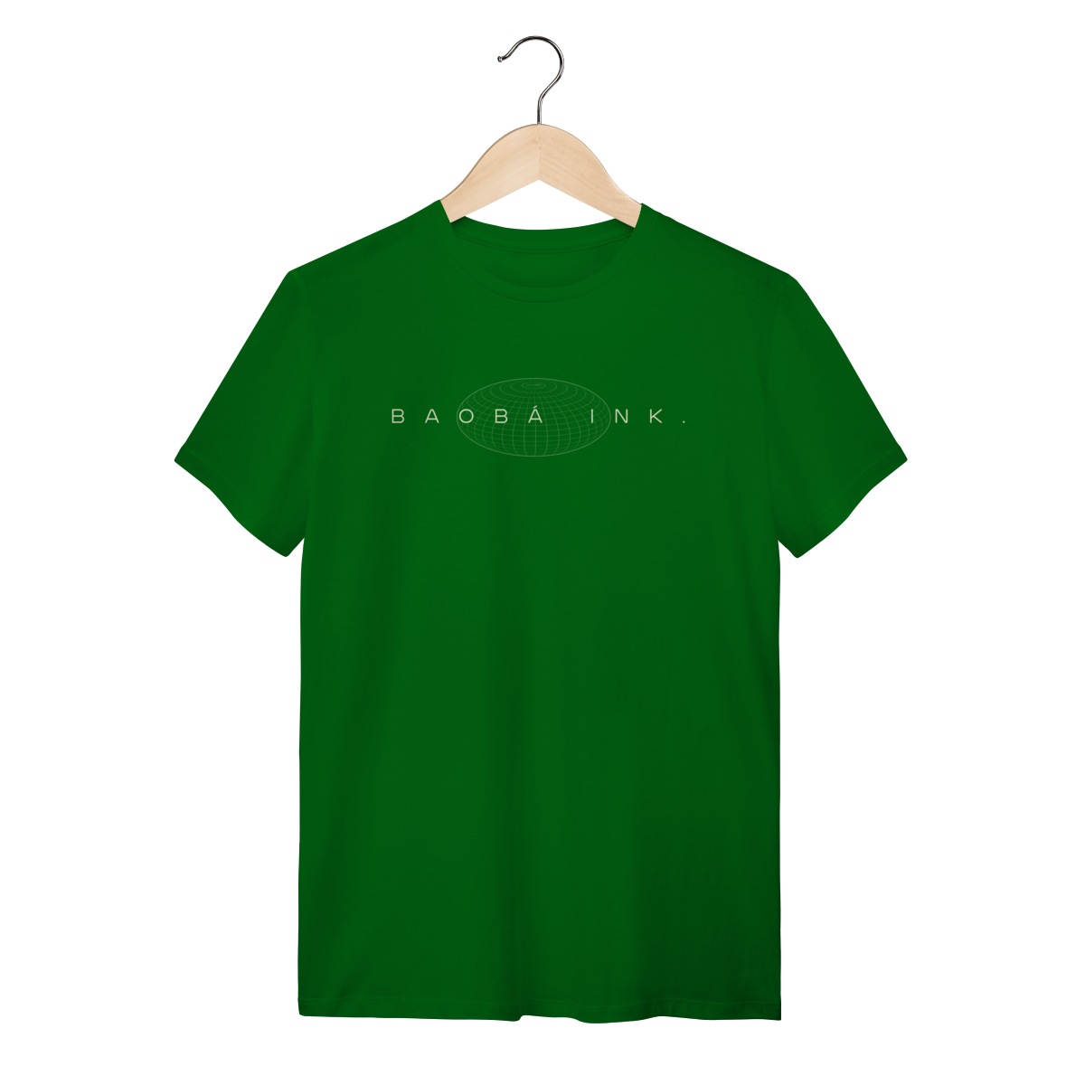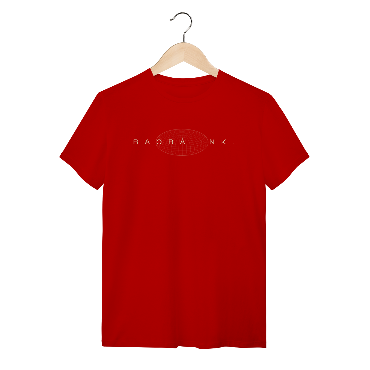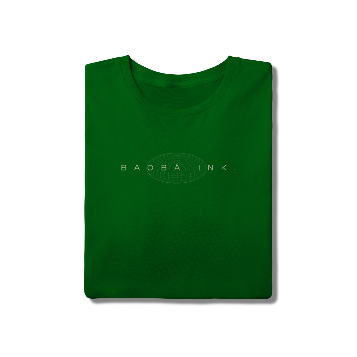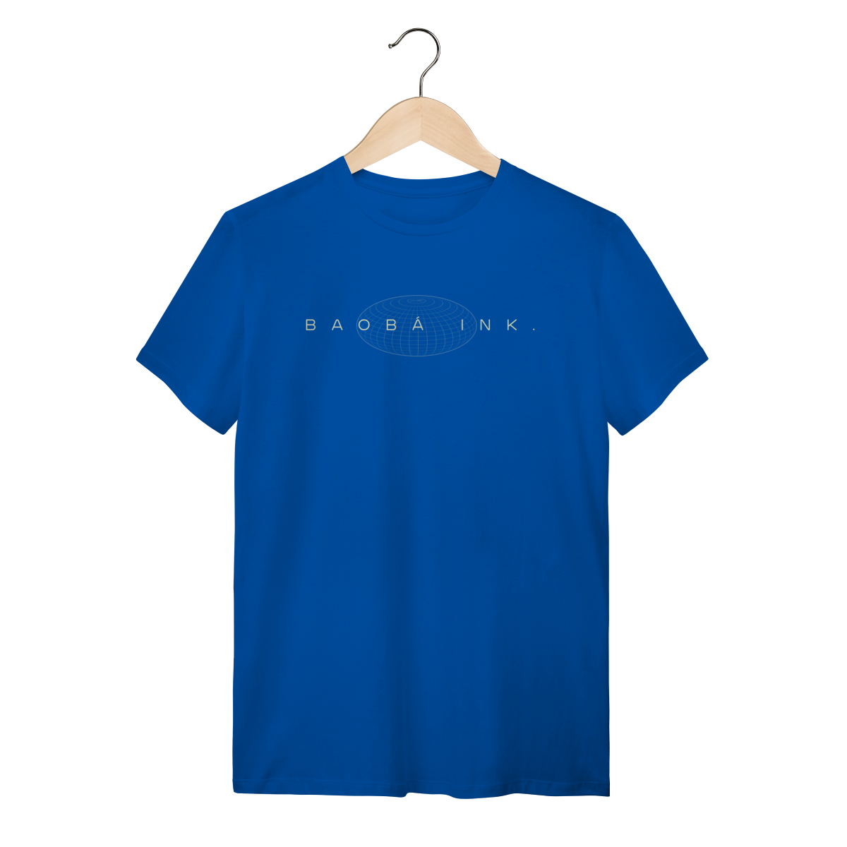 • Estampa frontal “BAOBÁ INK.” sobre esfera em wireframe, referência ao design digital e à expansão de ideias.