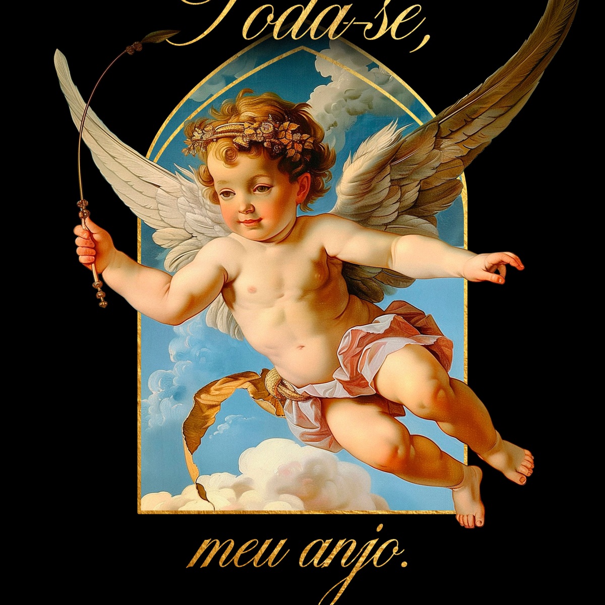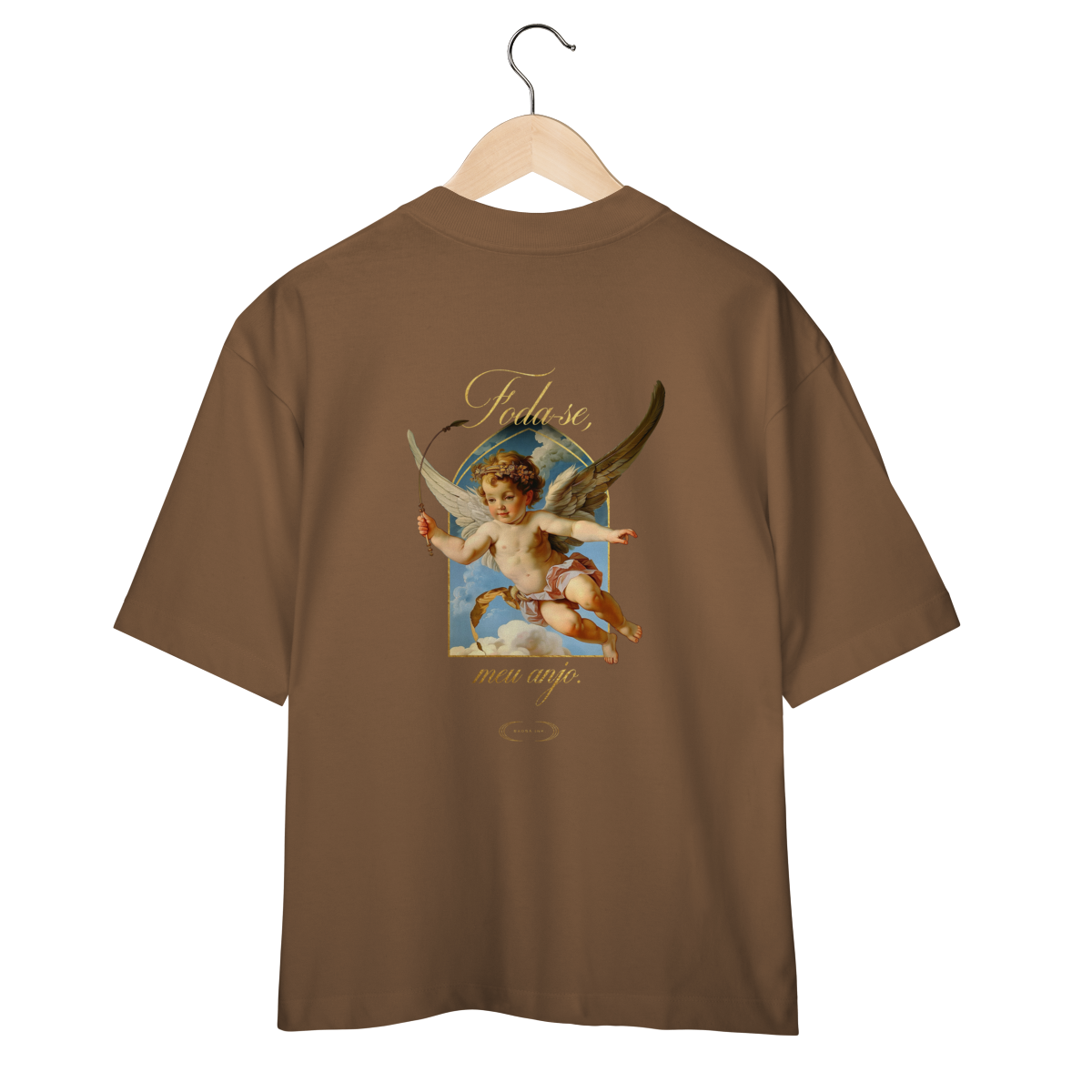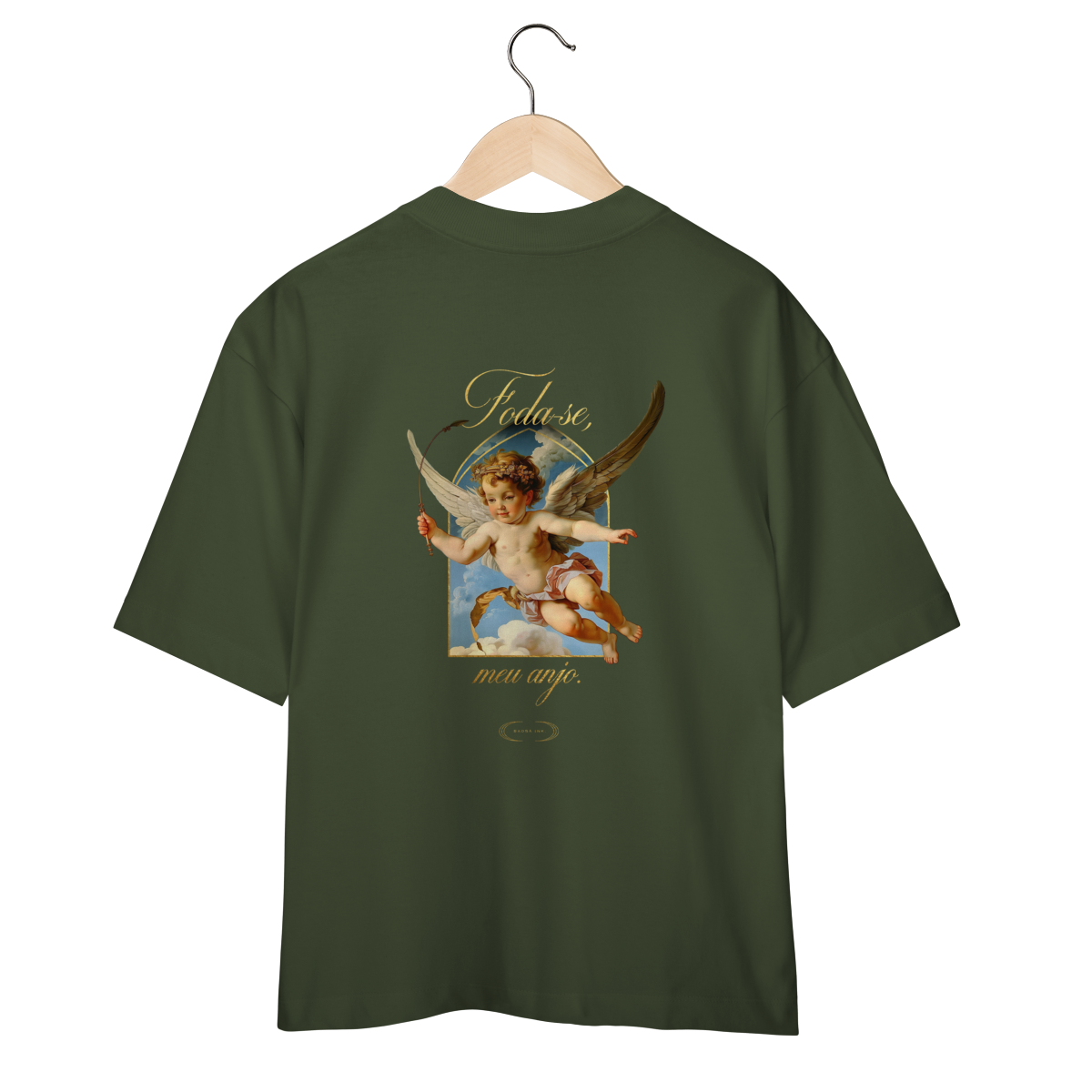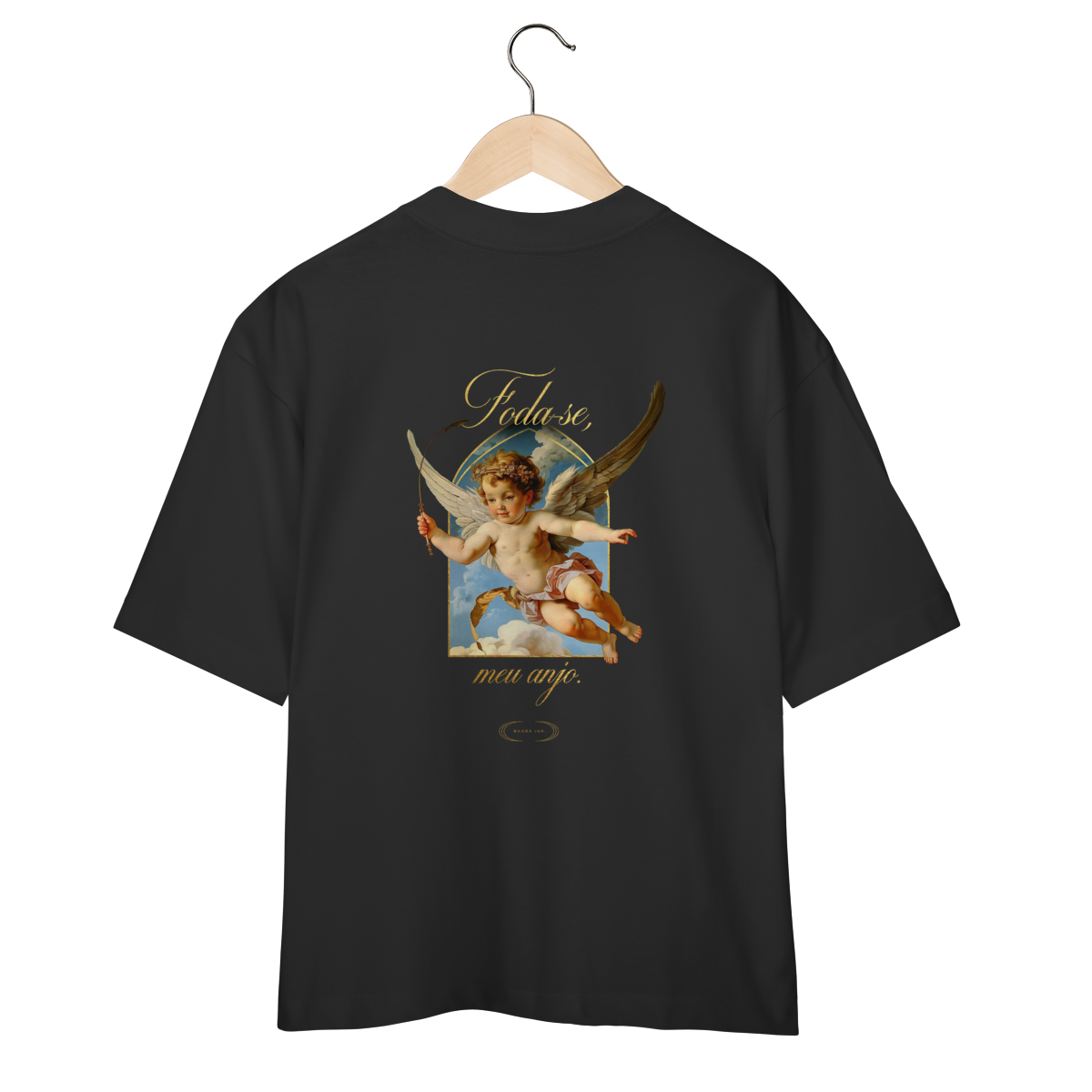 Camiseta Oversized “Foda-se, meu anjo.” é a definição de presença sem esforço. Minimalista de frente, com apenas o logo da Baobá Ink, e explosiva nas costas, com a icônica arte do anjo barroco e o toque dourado da irreverência.