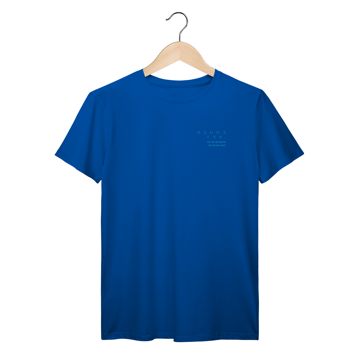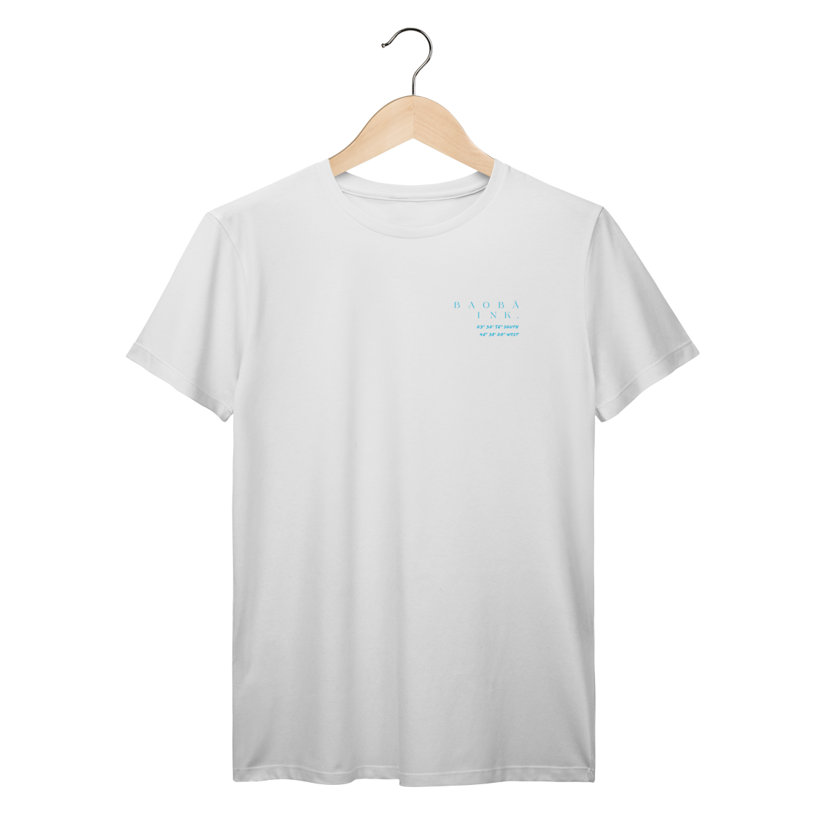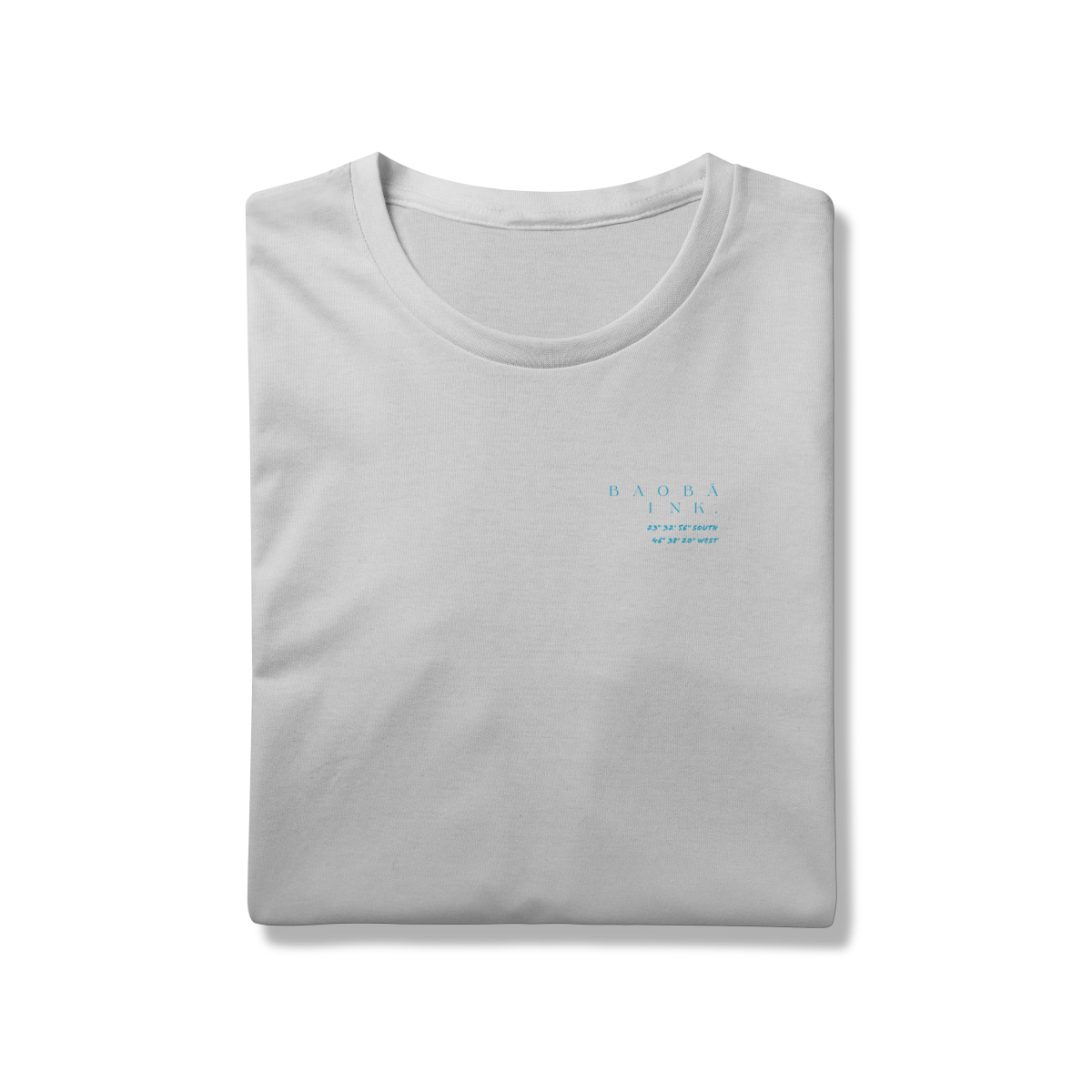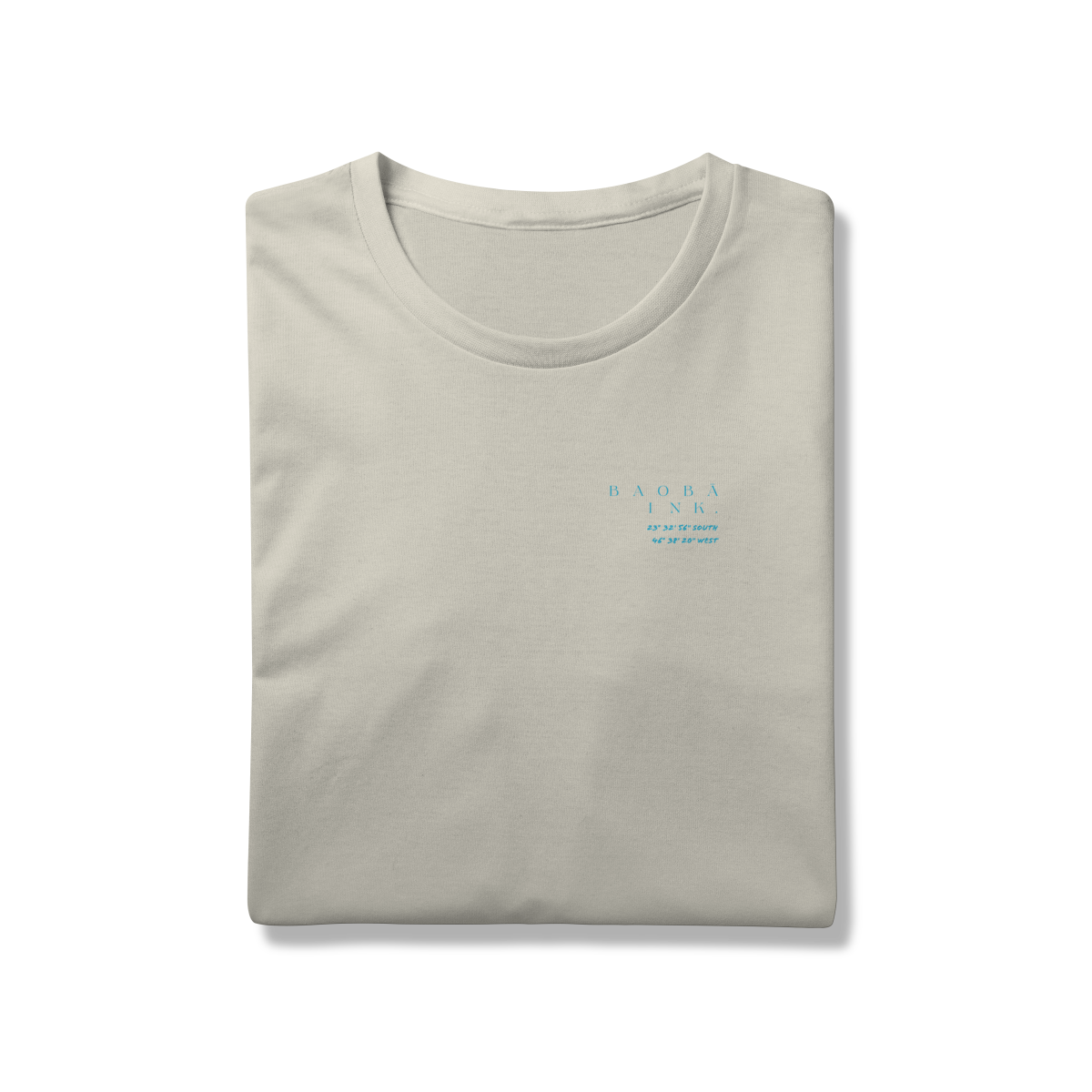 A arte minimalista em azul celeste imprime um visual moderno e contemplativo, combinando fotografia aérea e tipografia editorial — uma fusão de design, natureza e arte gráfica, assinatura da Baobá Ink.