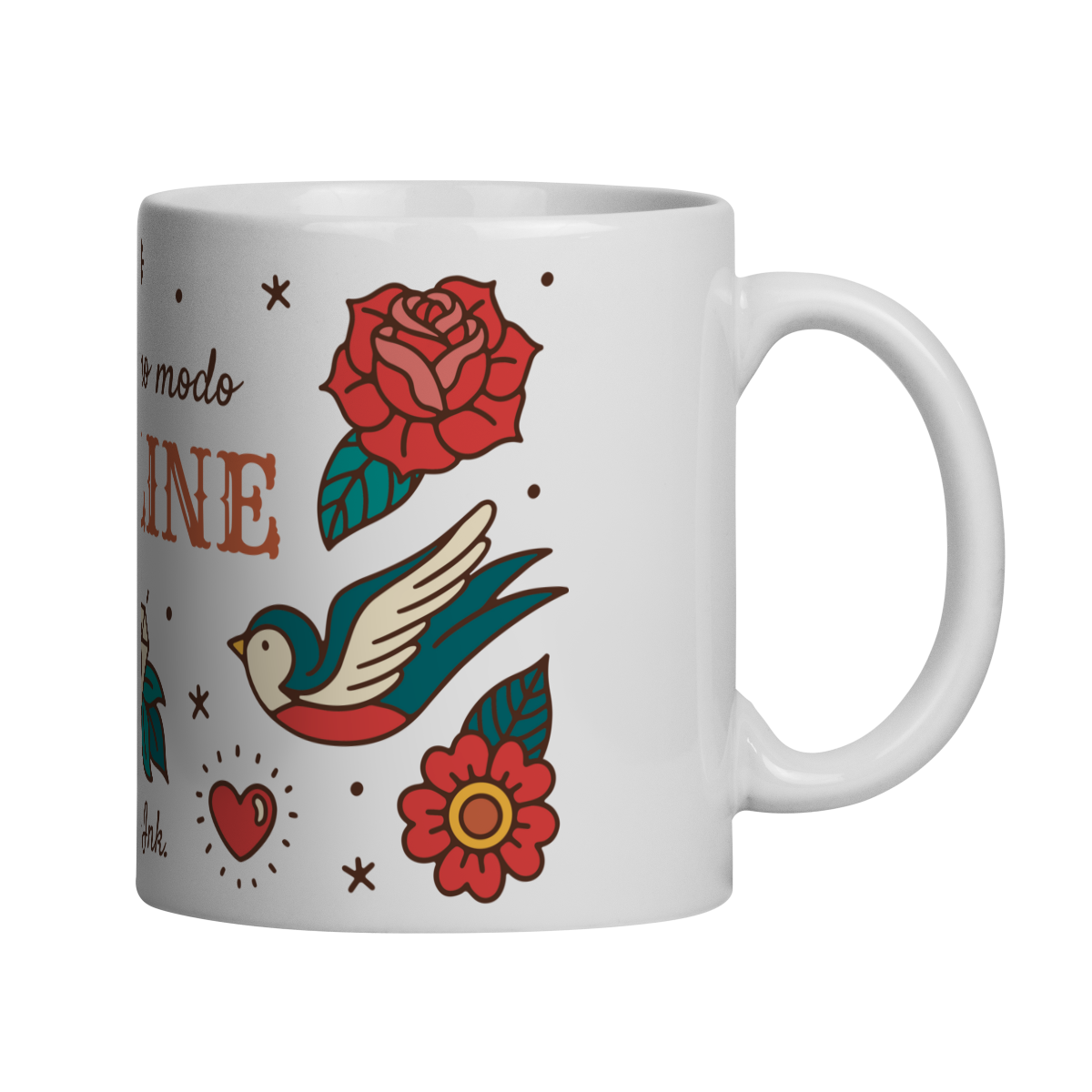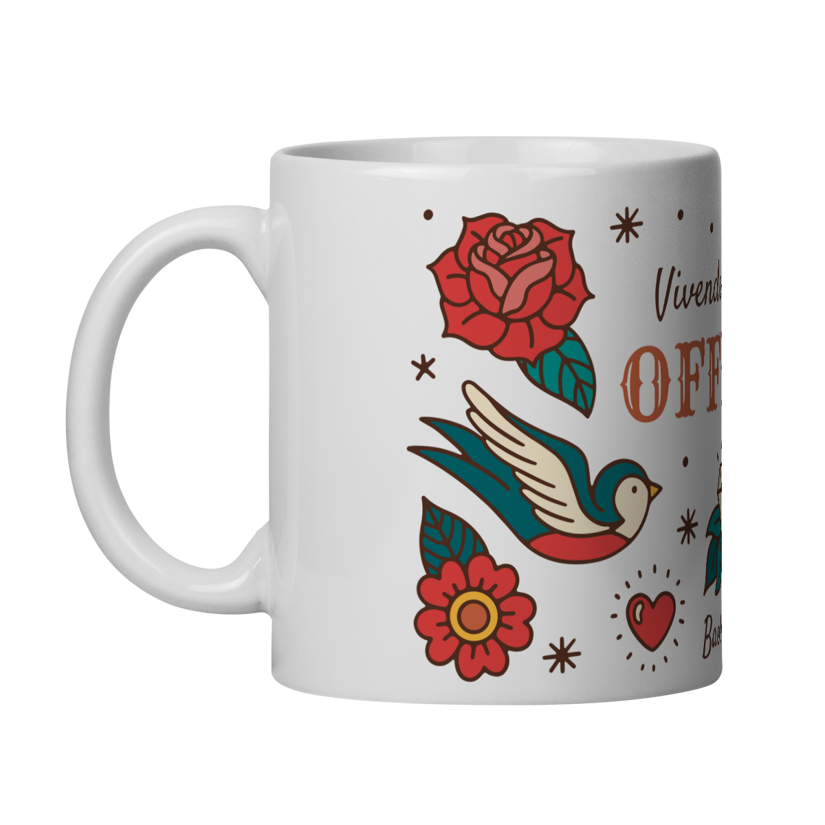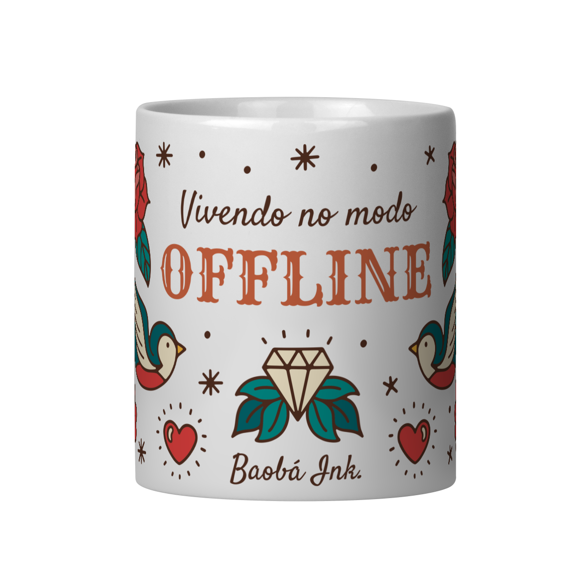 A caneca “Offline” da Baobá Ink combina arte e pausa — perfeita pra quem valoriza o momento do café sem notificações. A ilustração exclusiva traz flores, pássaros e o símbolo da liberdade, em cores vivas e traços vintage.
