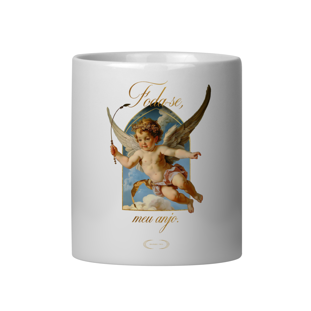 Caneca “Foda-se, meu anjo.” transforma a rotina em ritual — misturando arte clássica e sarcasmo moderno em um design que desafia o comum. O querubim barroco e a tipografia dourada criam o equilíbrio perfeito entre o delicado e o debochado.