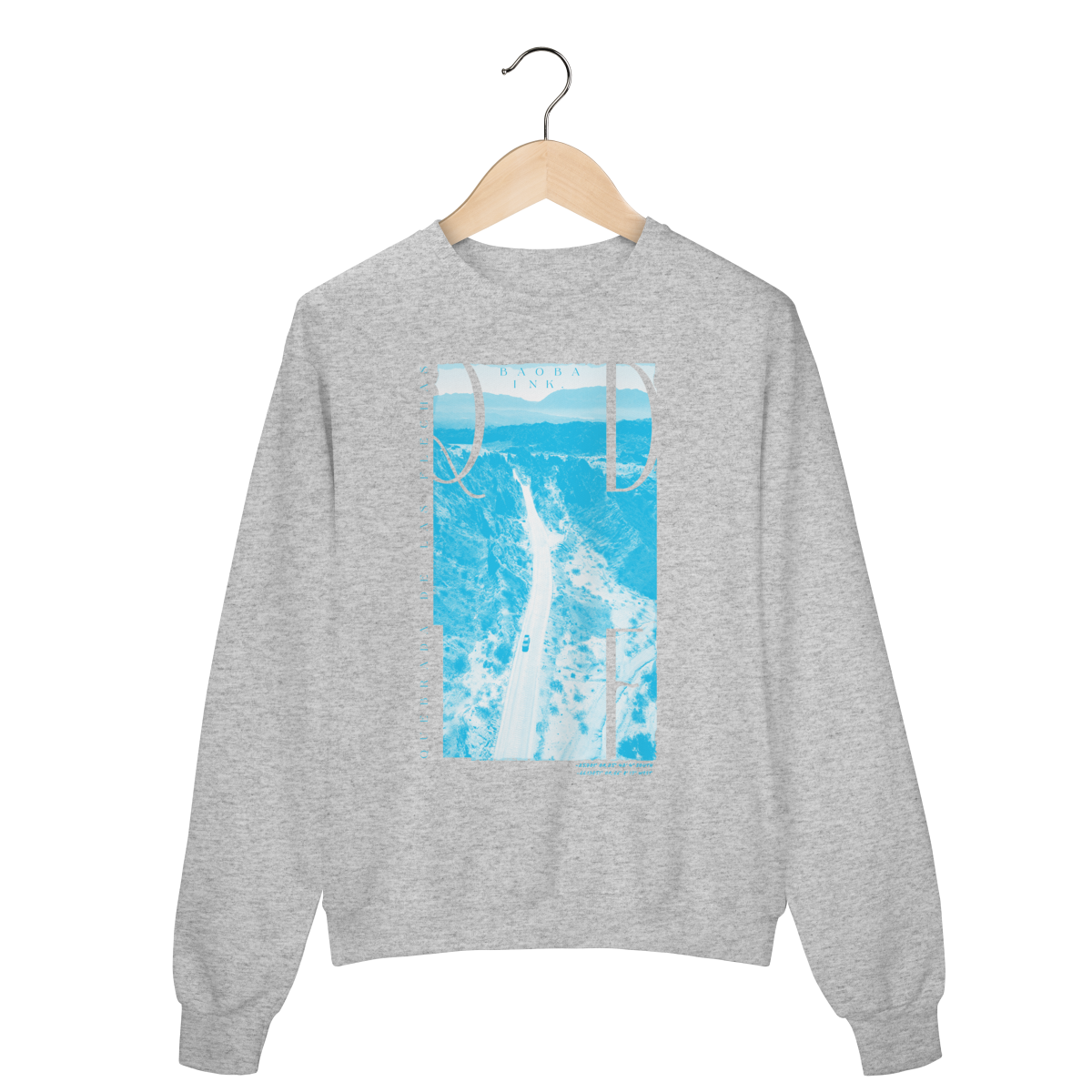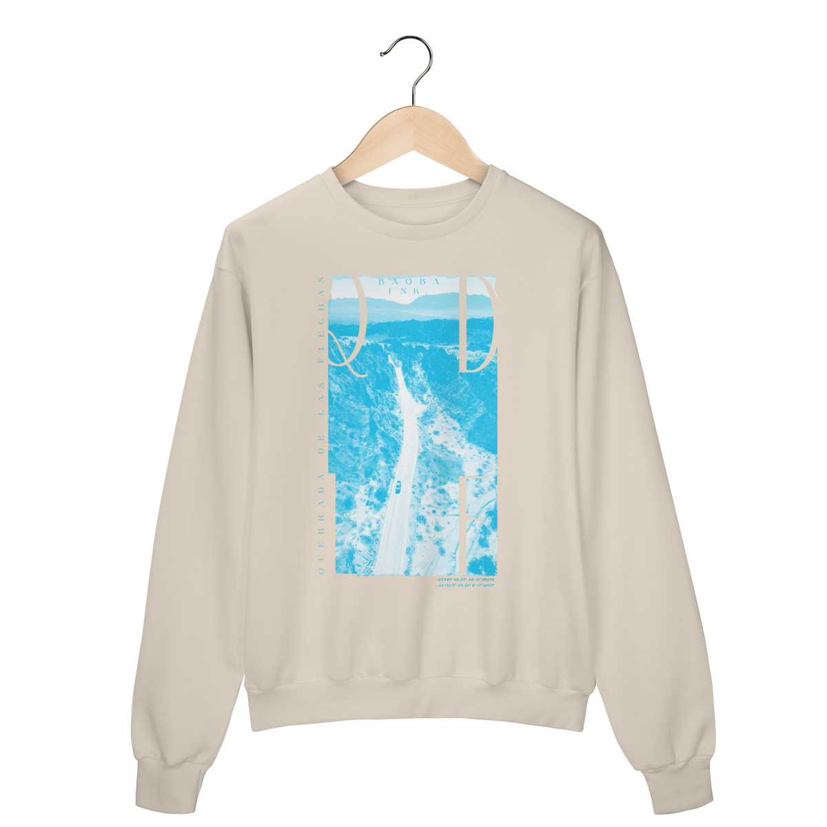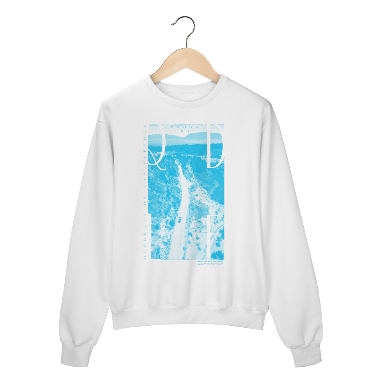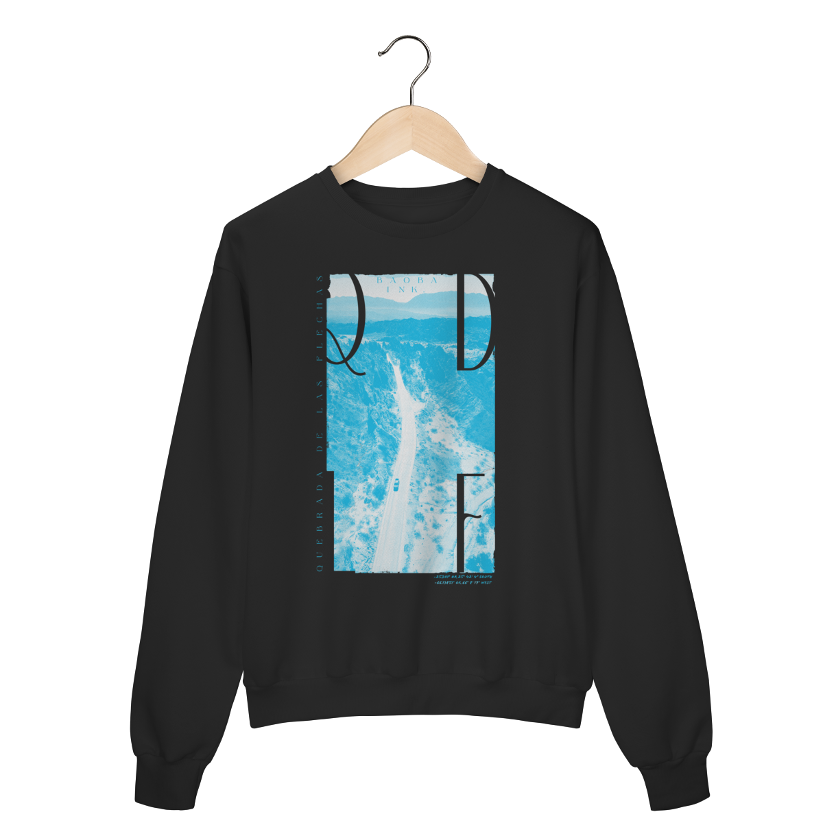 Inspirado na imensidão da Quebrada de las Flechas, no norte argentino, este moletom traduz o silêncio das estradas e a força das montanhas em uma arte minimalista azul celeste — marca registrada da Baobá Ink.