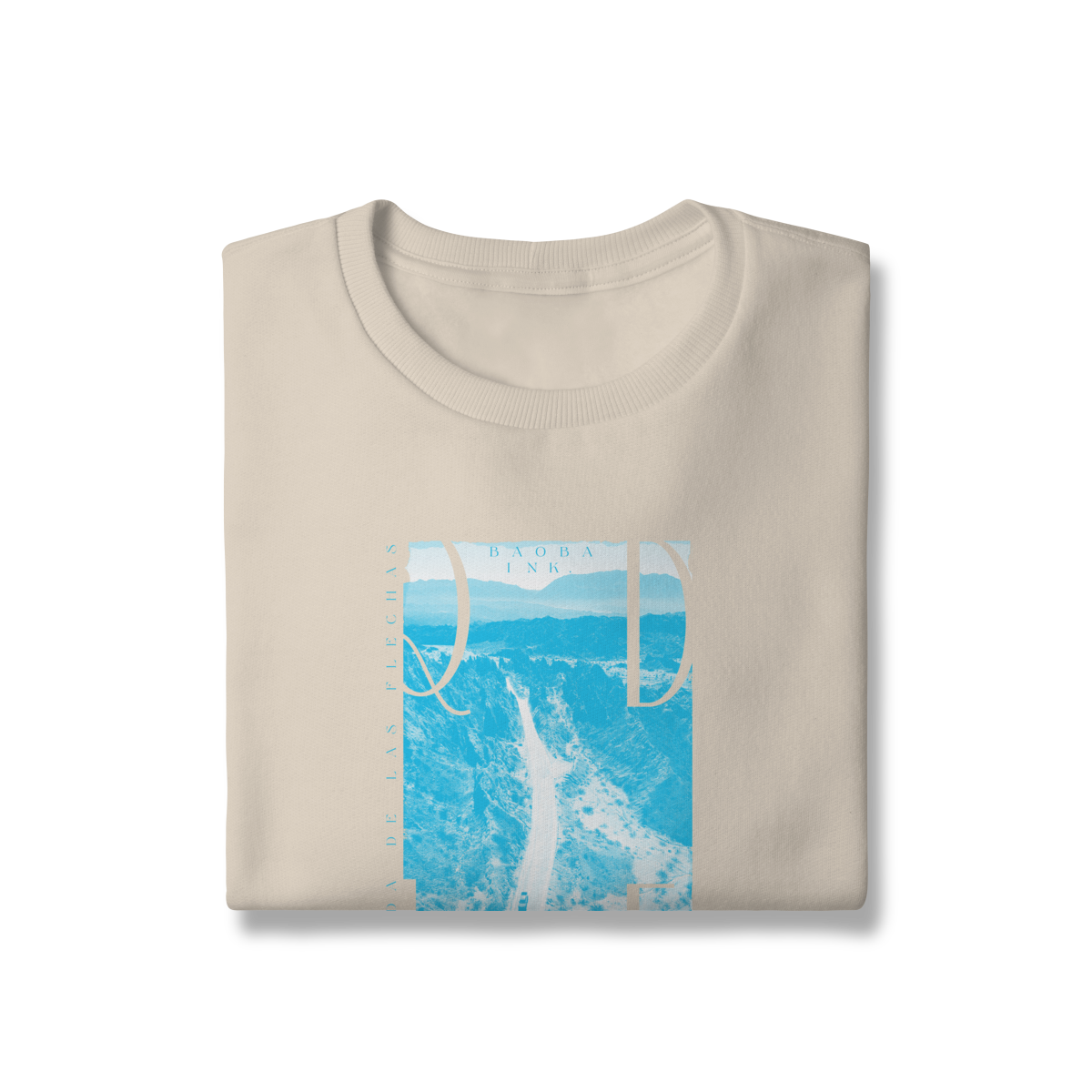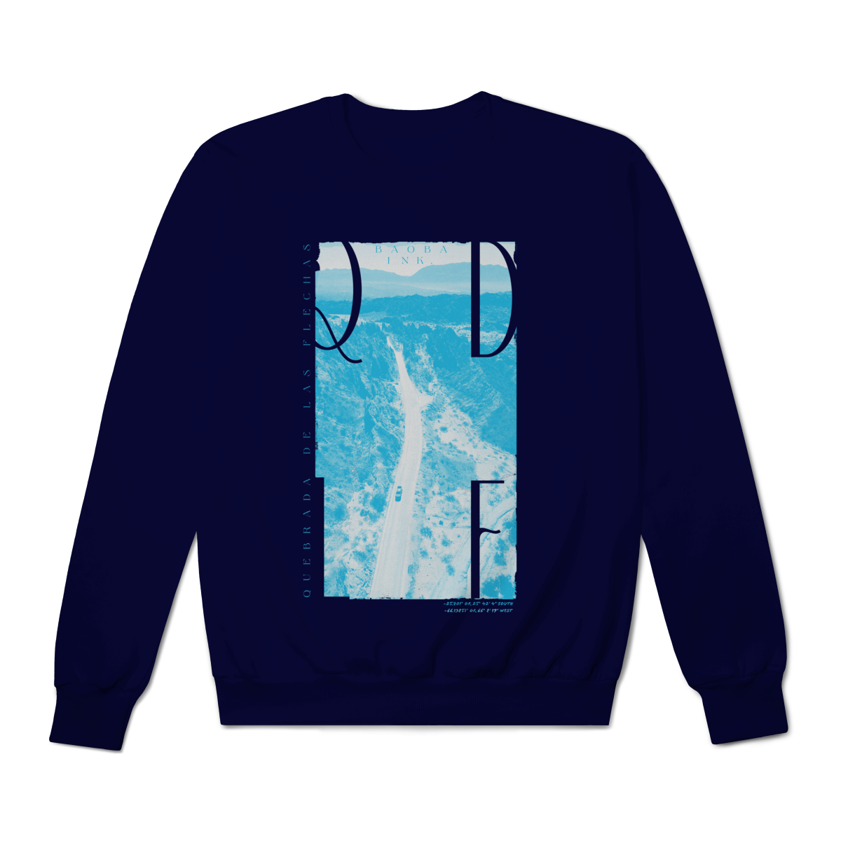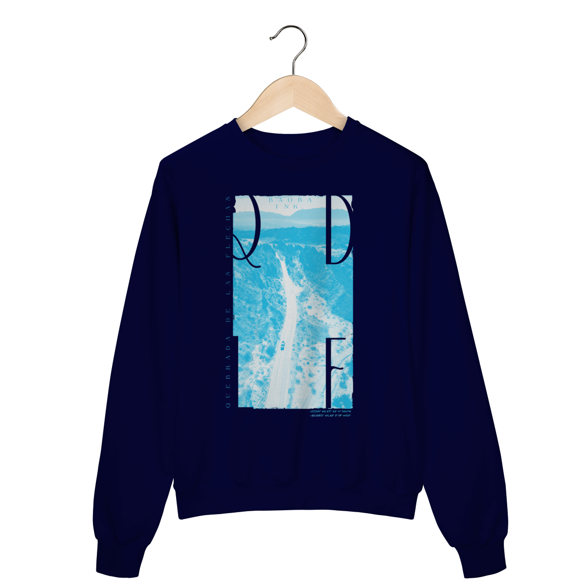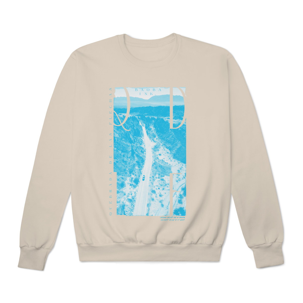 Inspirado na imensidão da Quebrada de las Flechas, no norte argentino, este moletom traduz o silêncio das estradas e a força das montanhas em uma arte minimalista azul celeste — marca registrada da Baobá Ink.