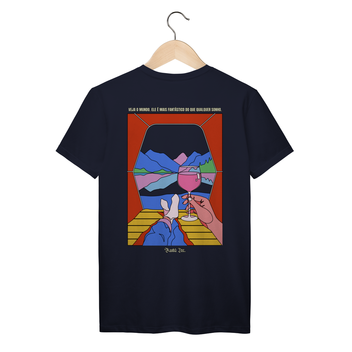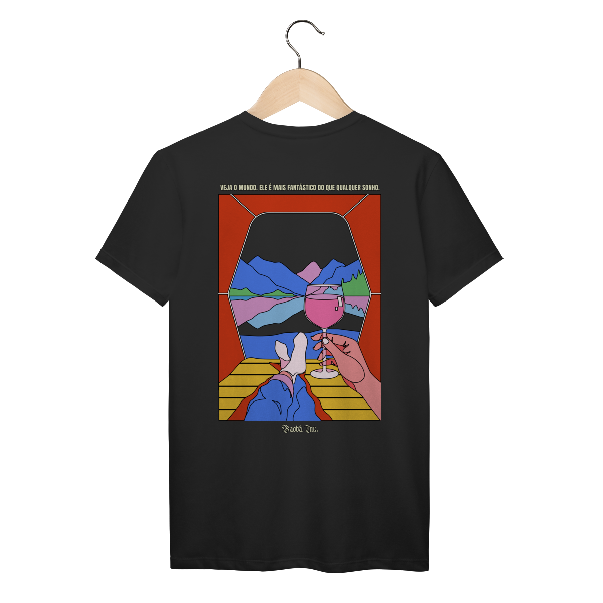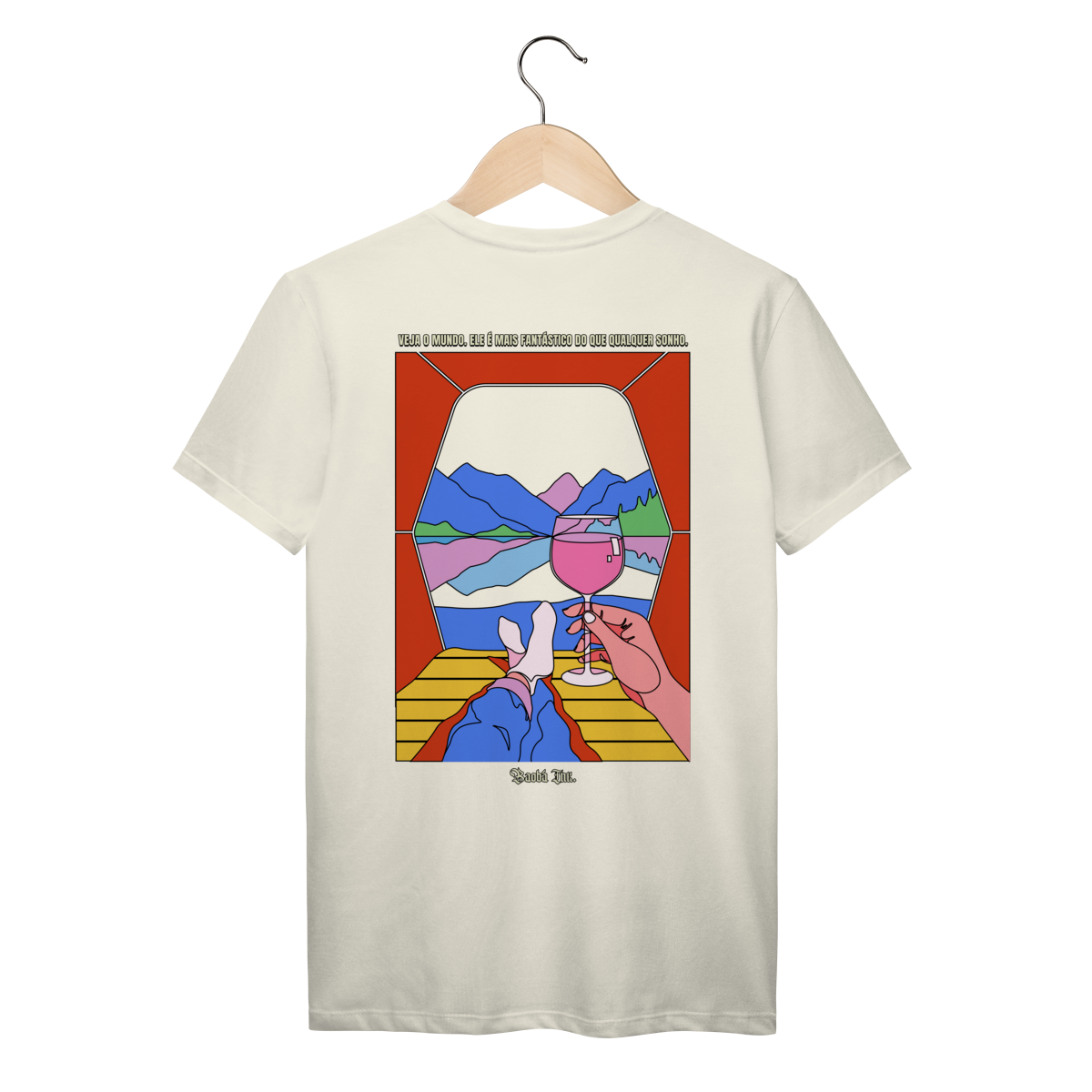 A estampa “Veja o Mundo” traz uma ilustração exclusiva da Baobá Ink inspirada na sensação de observar a imensidão lá fora — um lembrete de que o mundo real é mais fantástico do que qualquer sonho.